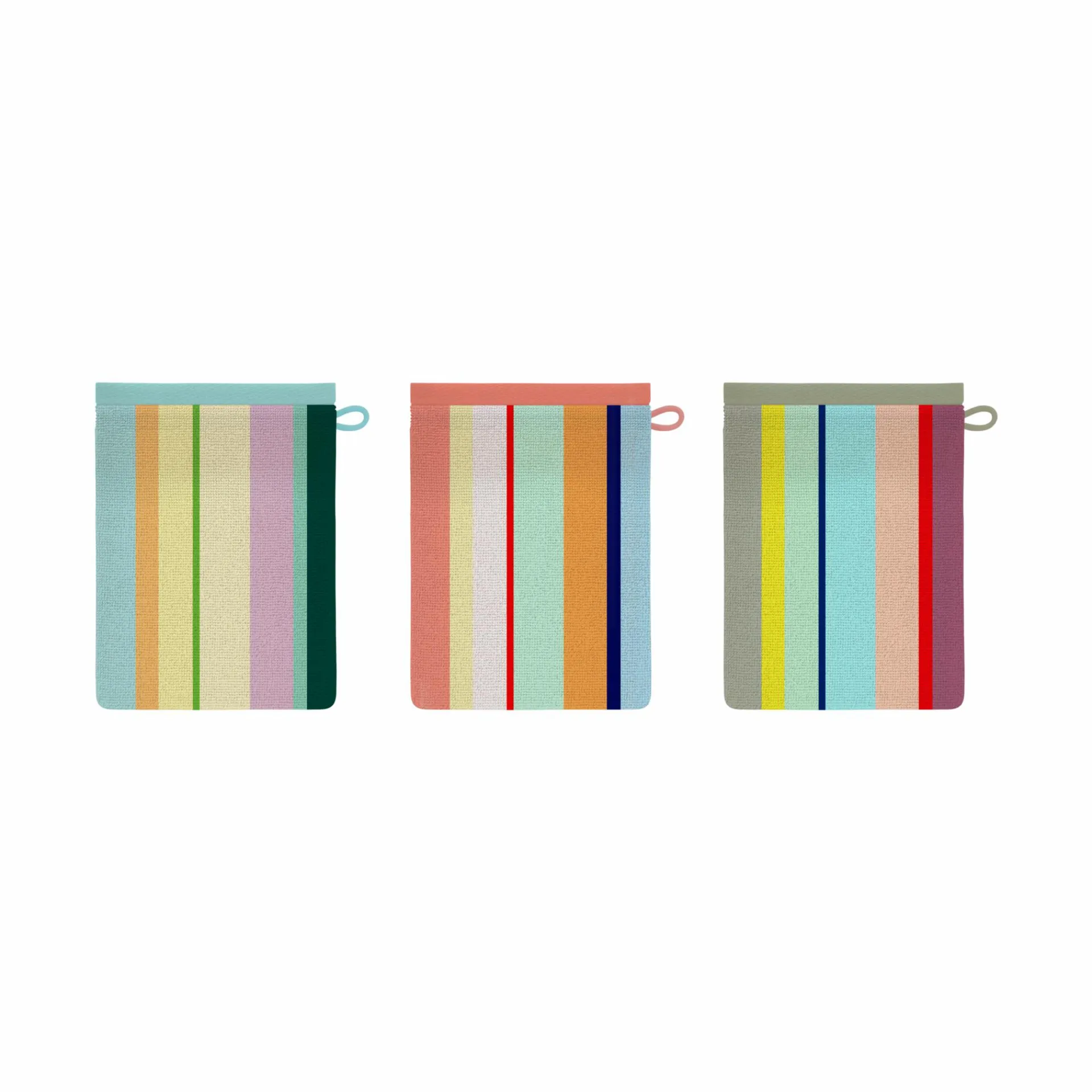 Badbasic in tollen Farben: hautfreundliche Waschhandschuhe im 3er-Set. Mit Lasche zum Aufhängen.