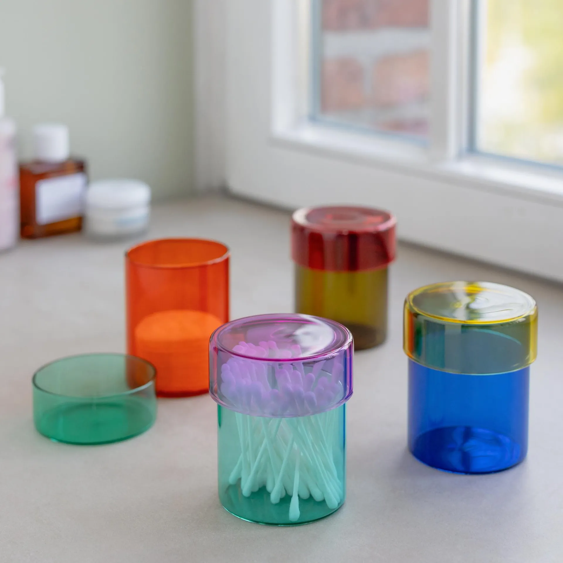 Die kleinen Glasdosen aus transparentem Glas sind ein richtiger Hingucker und ein schöner Ort für Wattepads, Schminkpinsel oder Zahnbürsten im Bad oder Büroartikel auf dem Schreibtisch.