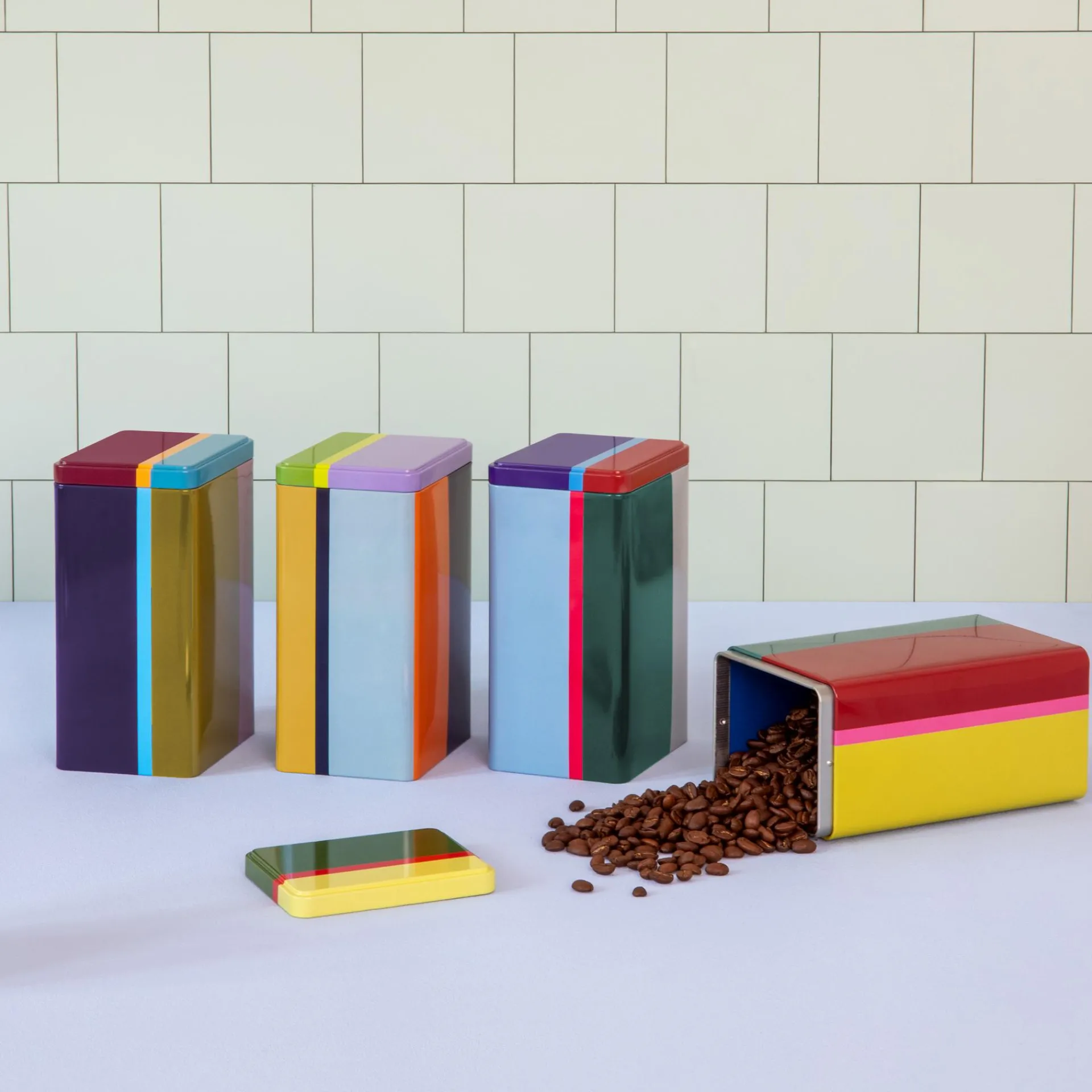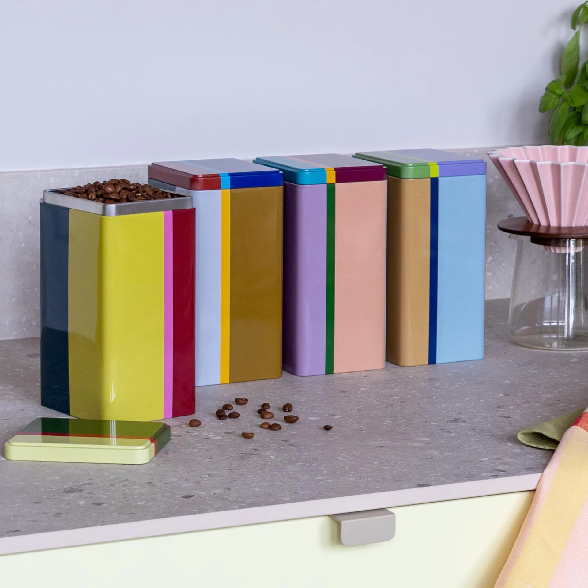 Keine Lust mehr auf angebrochene Verpackungen in Schrank und Regal? Nudeln, Reis, Kaffee oder Mehl warten ab jetzt in diesen dekorativen Aufbewahrungsdosen auf den nächsten Einsatz. Dank der schönen Farbkombinationen sind die Dosen nicht nur von außen ein bunter Lichtblick – auch ihr farbiges Innenleben sorgt für gute Laune bei den ganz alltäglichen Handgriffen.