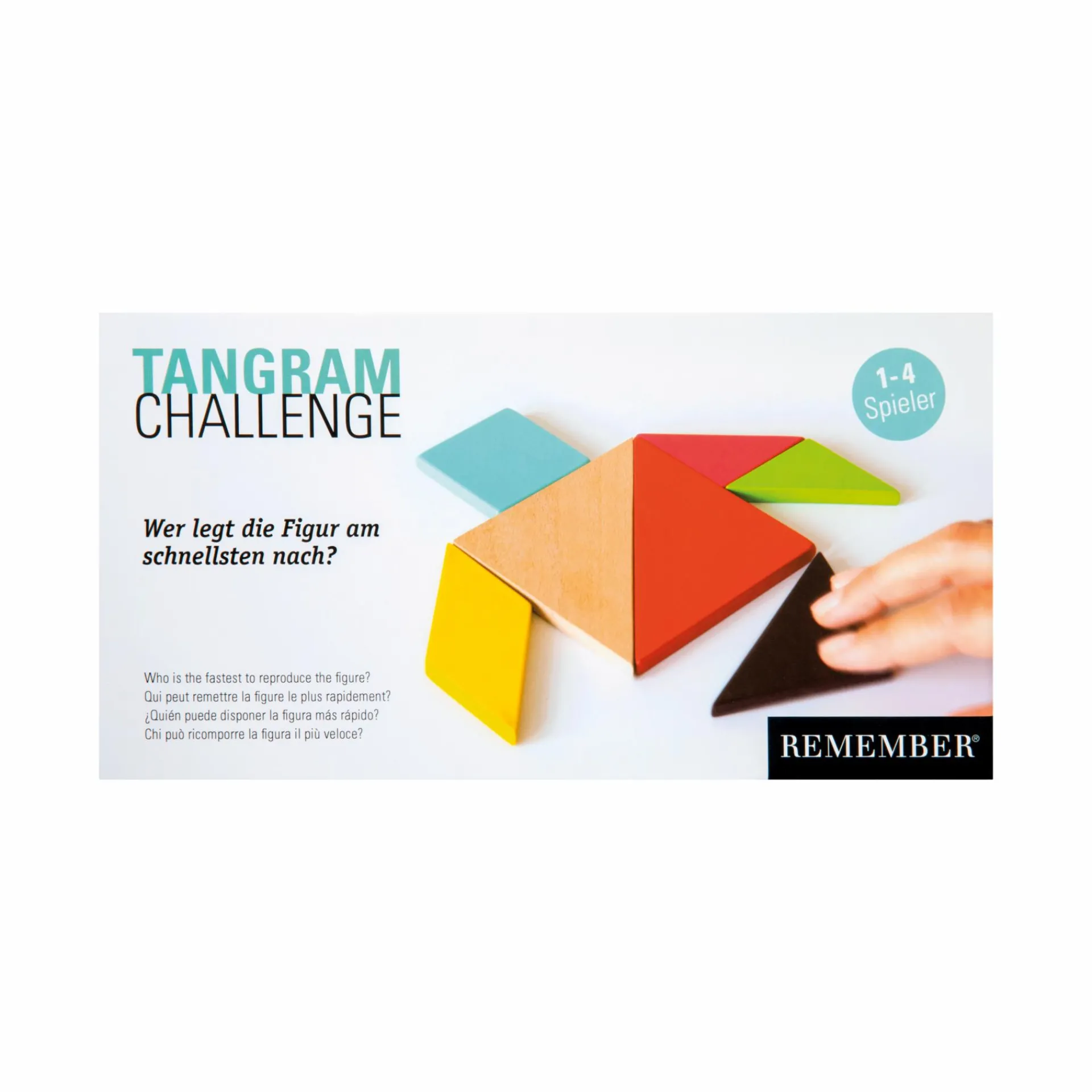 Ab 6 Jahren, 1-4 Spieler, 4 Tangrams mit je 7 Legesteinen in verschiedenen Farben, 200 unterschiedliche Vorlagekarten inkl. Spielanleitung und Lösungen