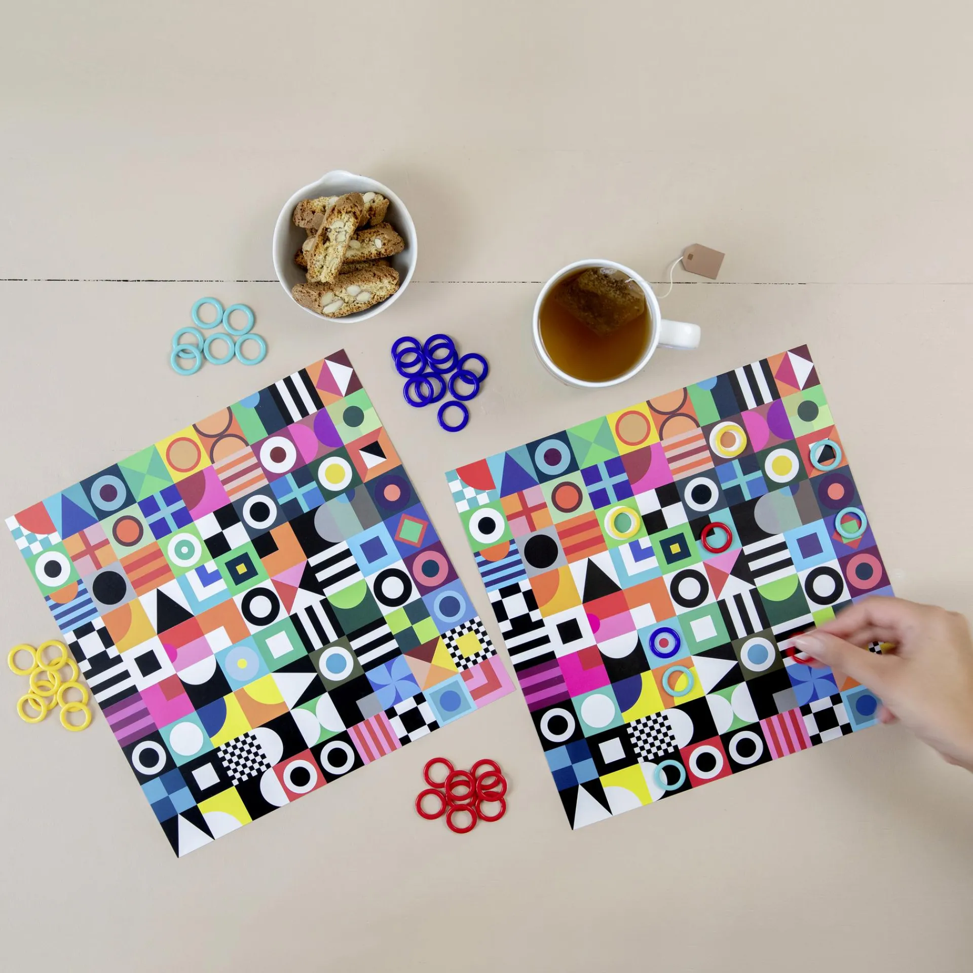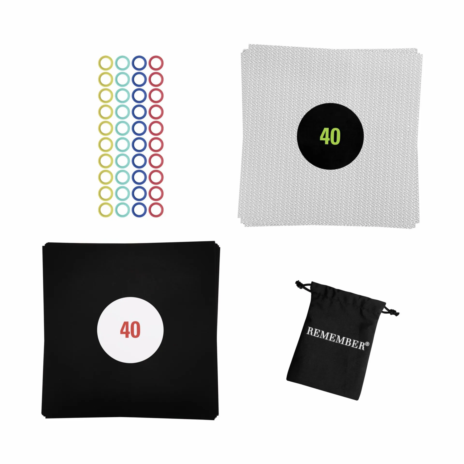 2 x 40 Spielblätter, 2 x 40 Spielringe im Baumwollbeutel, Lösungsbuch mit Spielanleitung