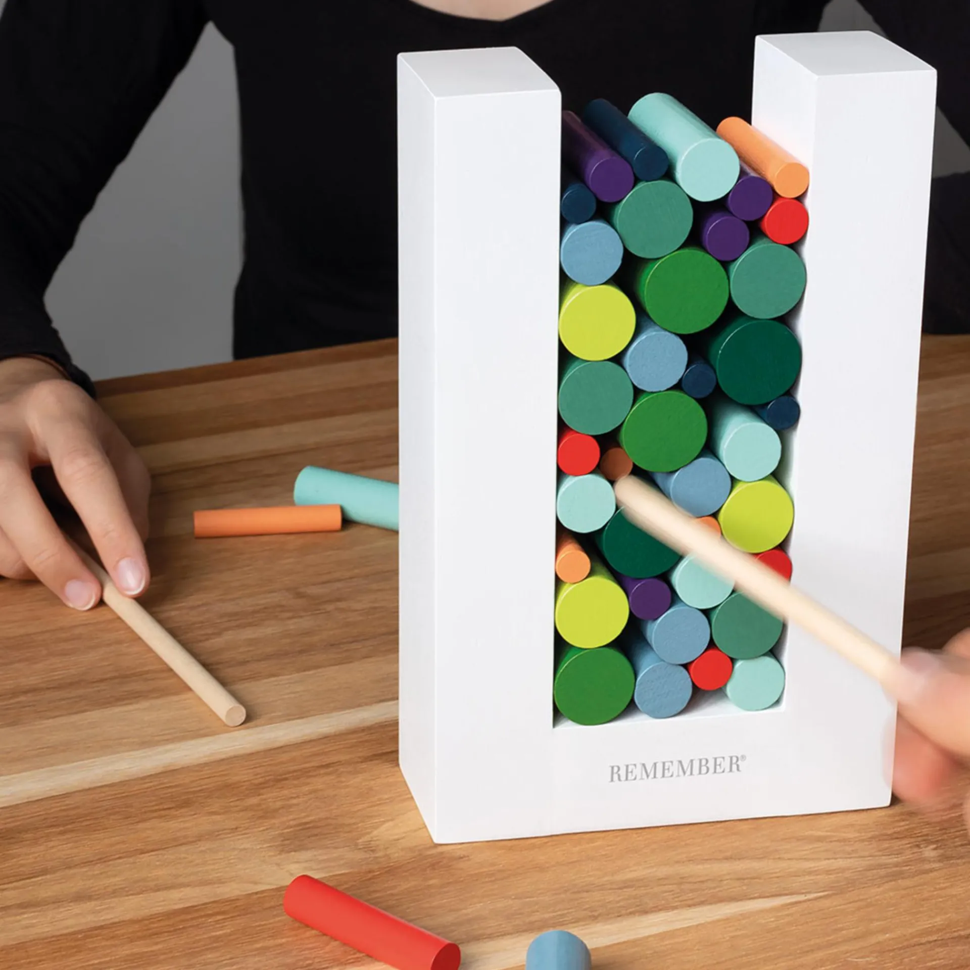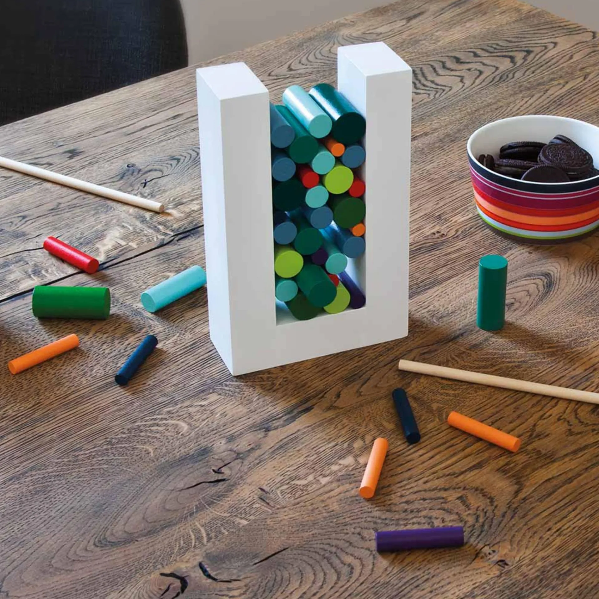 Bei diesem hübschen Spiel sind Konzentration und Geschick gefragt: Mit Hilfe der Holzstäbe müssen nach und nach die gestapelten, farbigen Holz-Zylinder aus dem Spielrahmen geschoben werden. Aber Achtung: Es darf nichts wackeln oder rutschen, sonst ist der nächste Spieler an der Reihe.