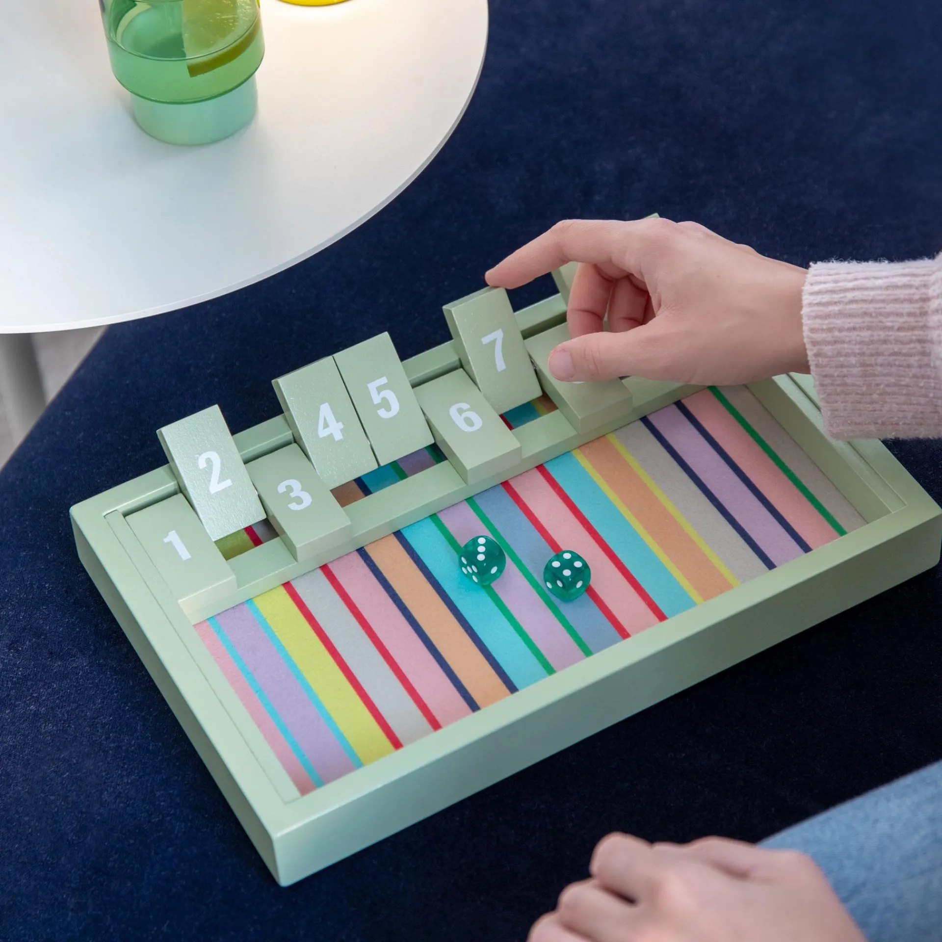 Schnelles Würfelspiel mit einfachen Regeln: Hier sind Würfelglück und Geschick gleichermaßen gefragt, denn jeder Spieler muss versuchen, möglichst viele der nummerierten Klappen der Box zu schließen. Wer alle Klappen schließen kann („Shut the box“), hat sofort gewonnen. Doch das ist nicht so einfach, wie es aussieht. Ein grandioser Spaß – für eine Person oder die ganze Familie.