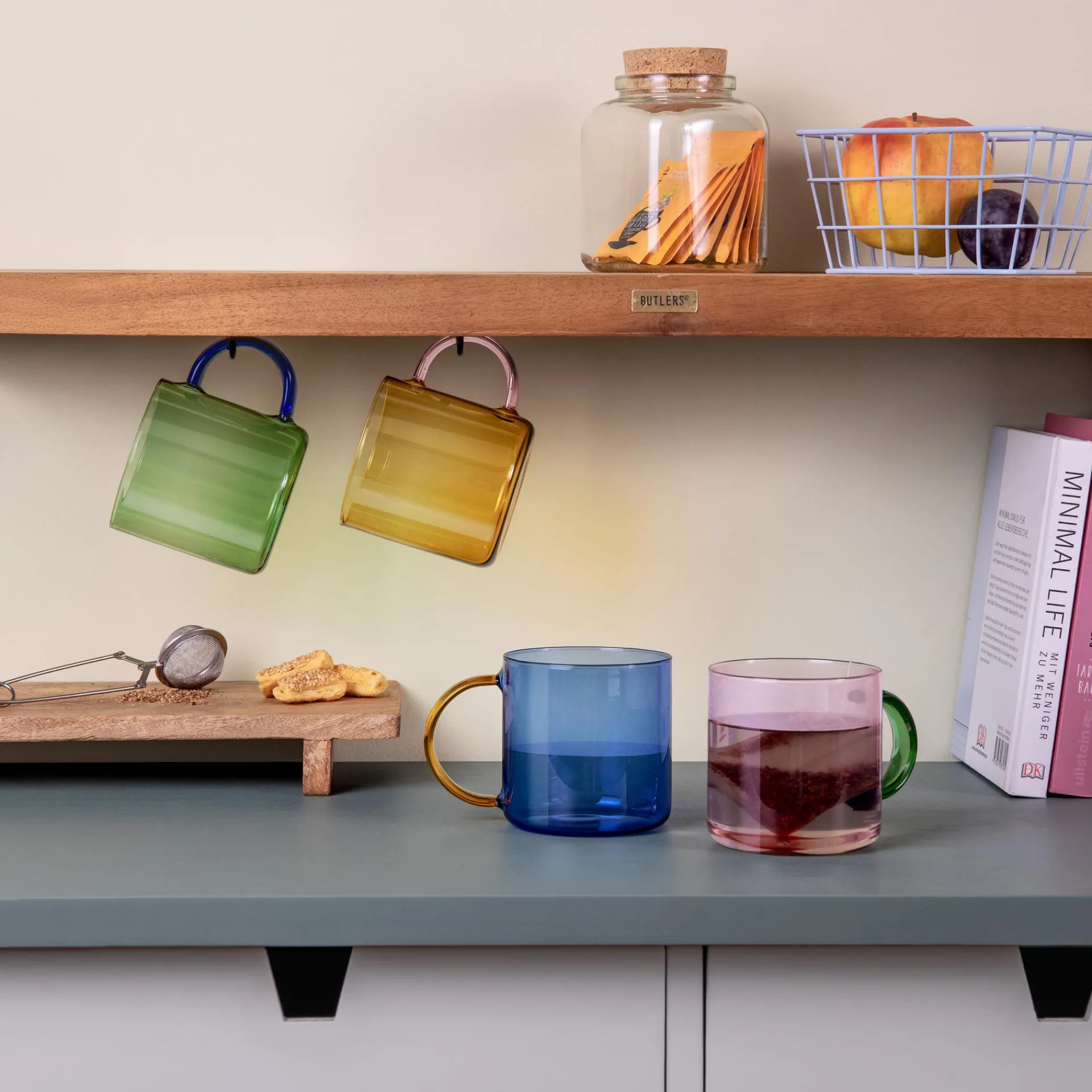 Becher aus gefärbtem Borosilikatglas, temperaturbeständig zwischen -10 °C und 110 °C, spülmaschinengeeignet