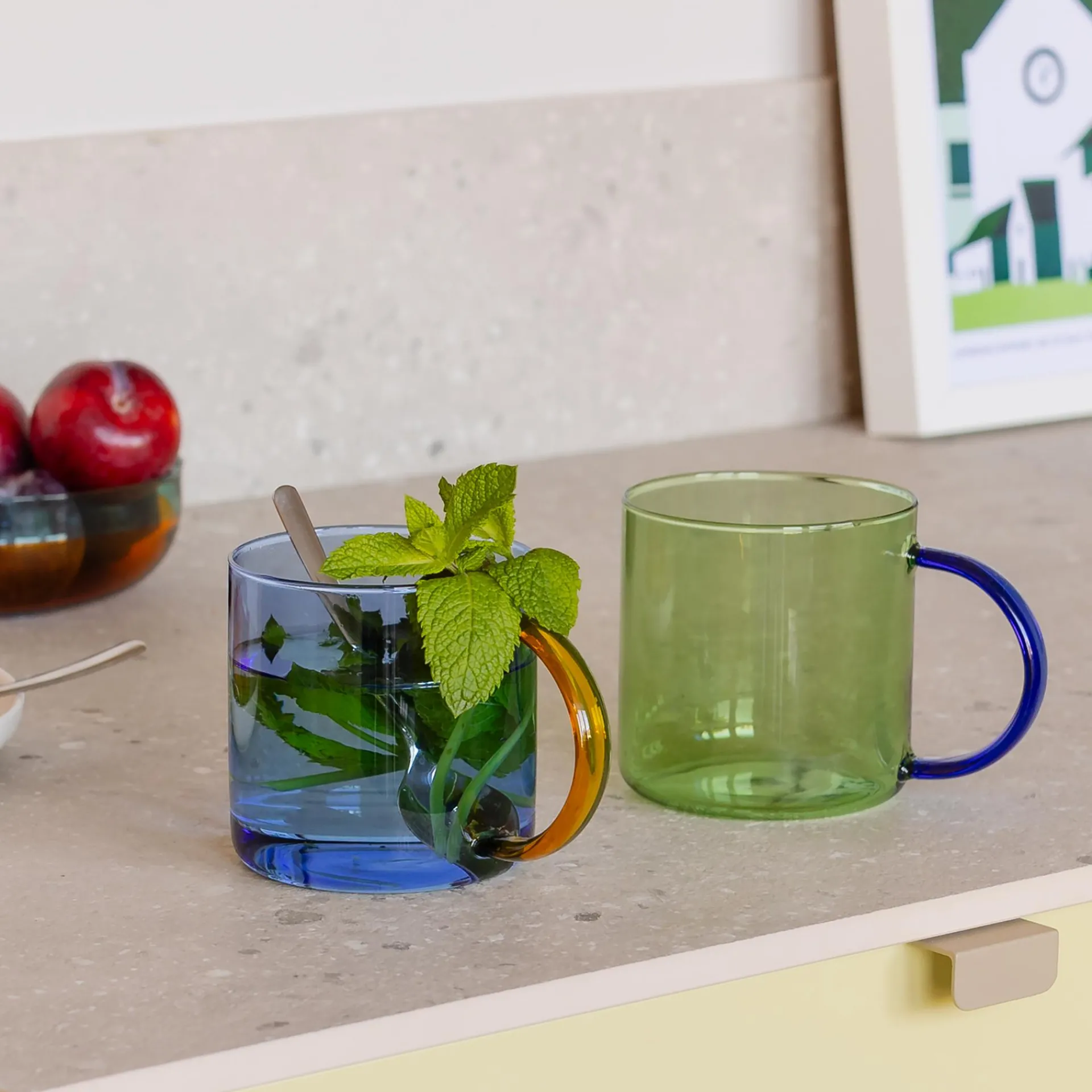 Ob heiße Schokolade oder Eiskaffee – dank des Borosilikatglases ist der Glasbecher mit dem hübschen farbigen Henkel zart und robust zugleich. Heiße Getränke oder gefrorene Desserts können dem Material nichts anhaben. Und auch gestalterisch ist der Becher ein Meister der Kontraste, denn der filigrane Becher besitzt ein Fassungsvermögen von großzügigen 500 Millilitern.