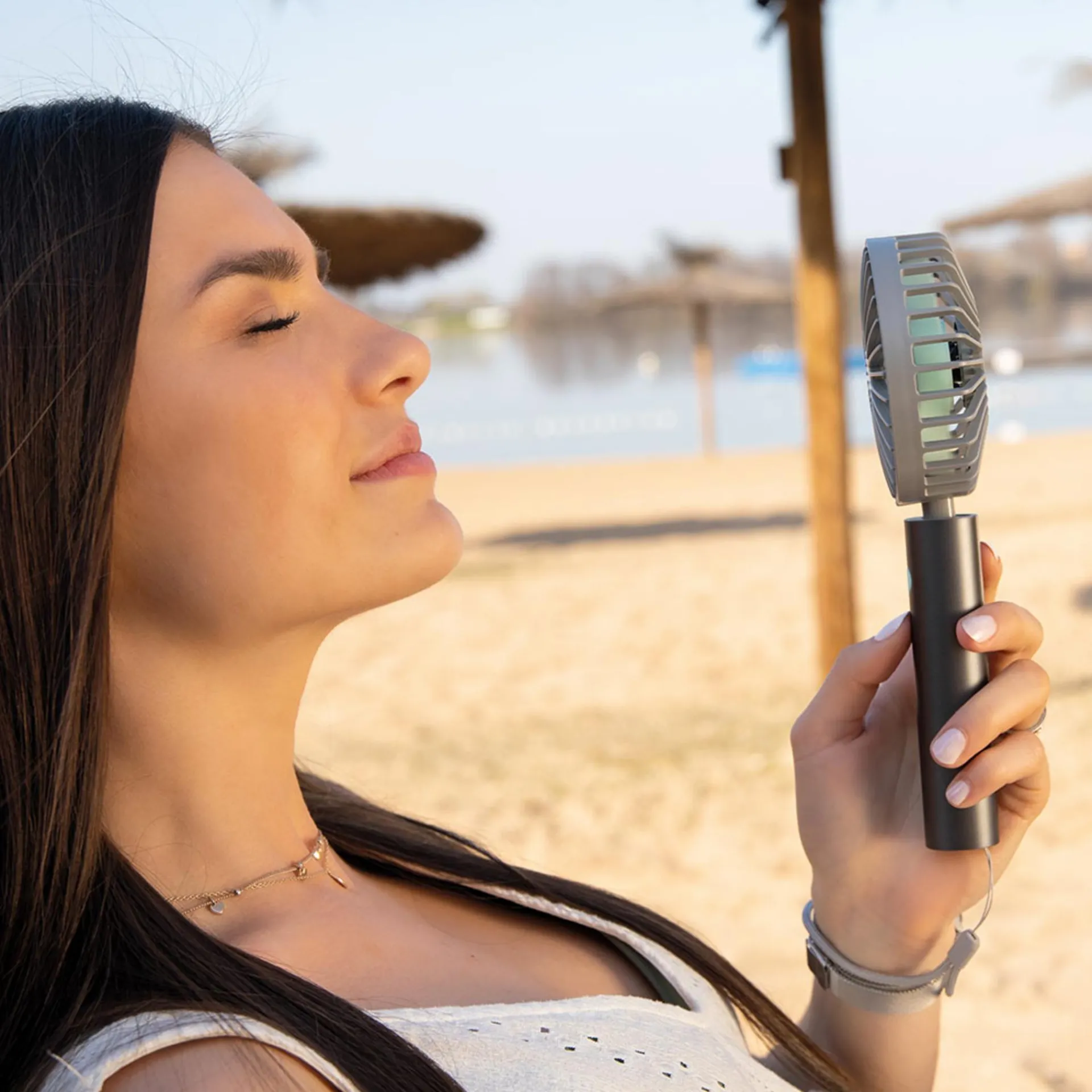 Handlich, mobil, stylisch – der aufladbare Akku-Ventilator Flow für drinnen & draußen sorgt für viel frischen Wind. Mit Standfuß und Handschlaufe sorgt Flow immer für eine kühle Brise – egal, ob man am Schreibtisch s(chw)itzt oder in der U-Bahn steht. Aufladen kann man Flow ganz bequem mit dem beiliegenden USB-Kabel.
