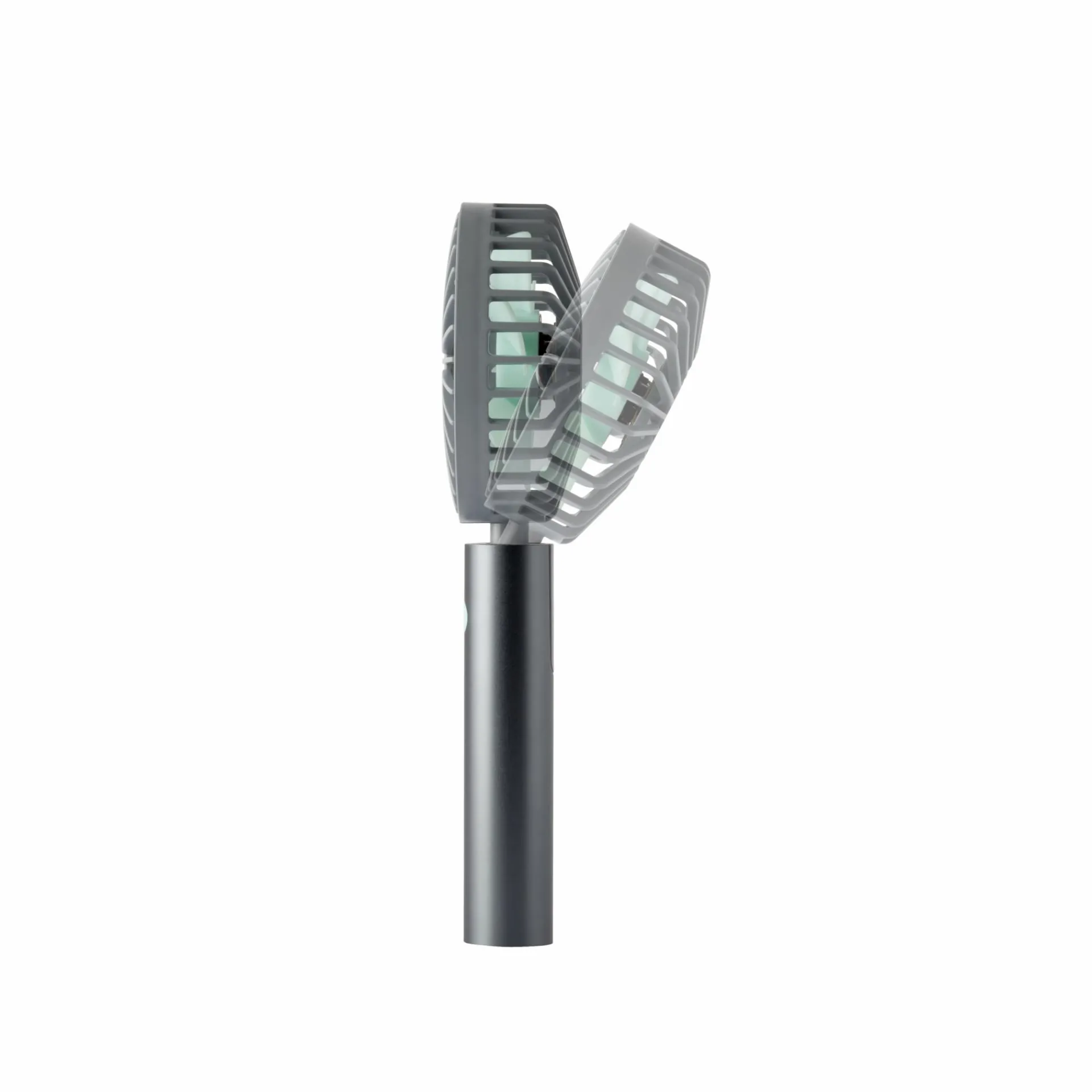 Wiederaufladbar via USB-Kabel, inkl. transparentem Standfuß, Handschlaufe, 3 Geschwindigkeitsstufen, schwenkbarer Kopf, Akku-/Ladestandanzeige, Laufzeit bis zu 7 Stunden, Ladezeit ca. 2 Stunden, Akkubetrieb: 2000 mA / 5V, Gewicht 200g, Netzteil nicht enthalten