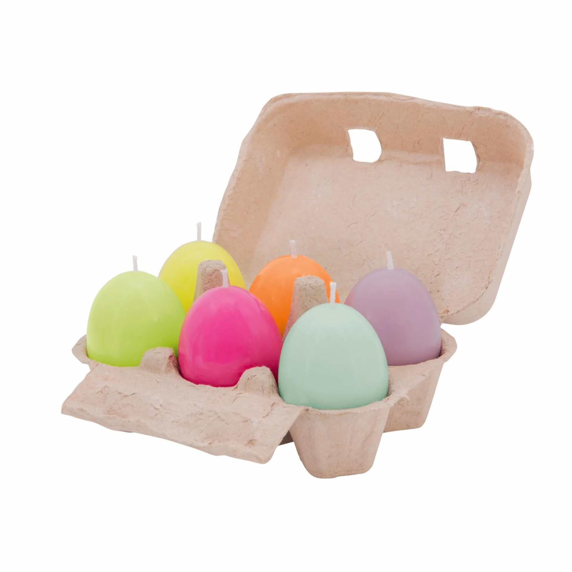 Welche Henne hat denn diese Eier gelegt? Öffnet man den Eierkarton, kommen sechs verschiedenfarbige Kerzen in Eierform zum Vorschein.