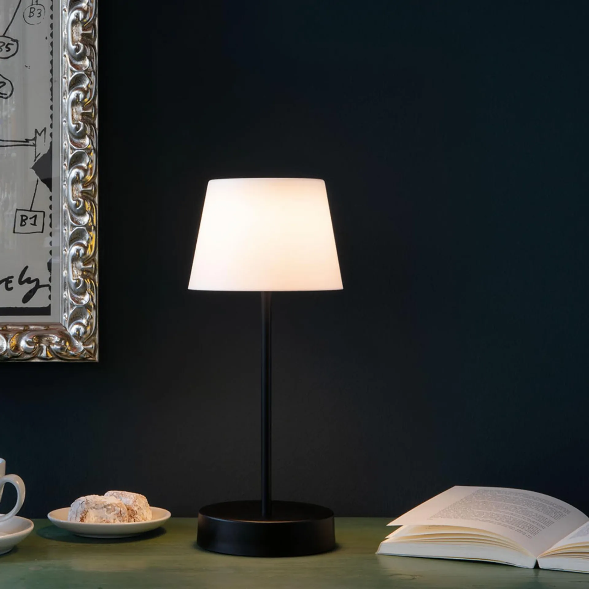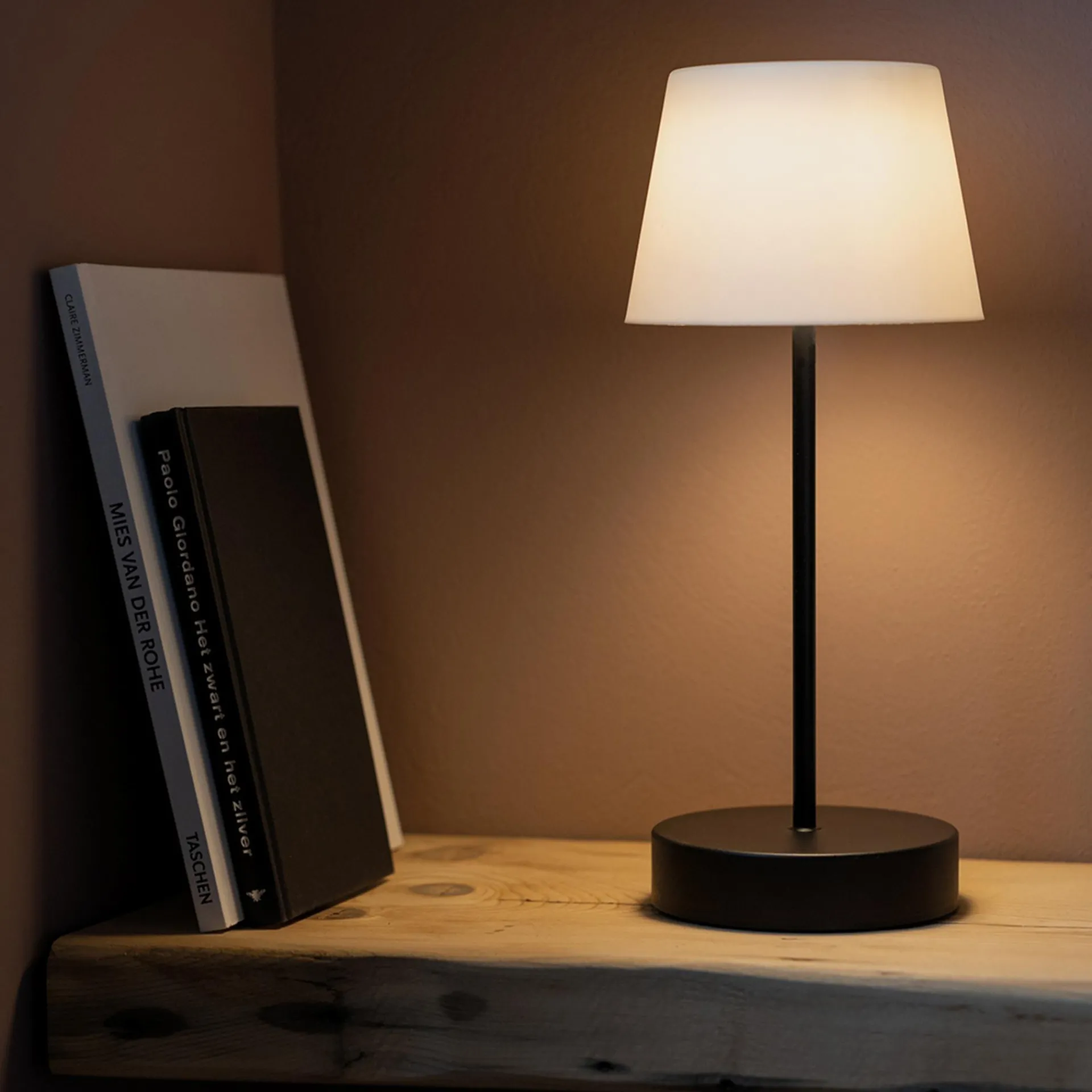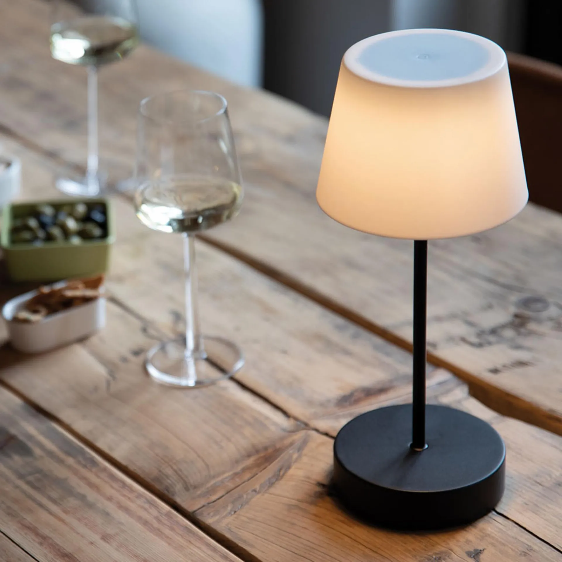 Klassisches Leuchtendesign trifft moderne Lichttechnik: Die energieeffiziente LED-Tischleuchte Oscar schafft ein behagliches Lichtambiente, wo immer man gerade möchte. Über das USB-Kabel aufgeladen, leuchtet sie bis zu 80 Stunden mit einer Akkuladung und wandert von der Kommode auf den Esstisch, dann auf den Nachtschrank und wieder zurück. Einfacher geht es kaum: Kurz oben angetippt, schon ist Oscar ein- und ausgeschaltet sowie in drei Stufen dimmbar. Auch für den Außenbereich geeignet.