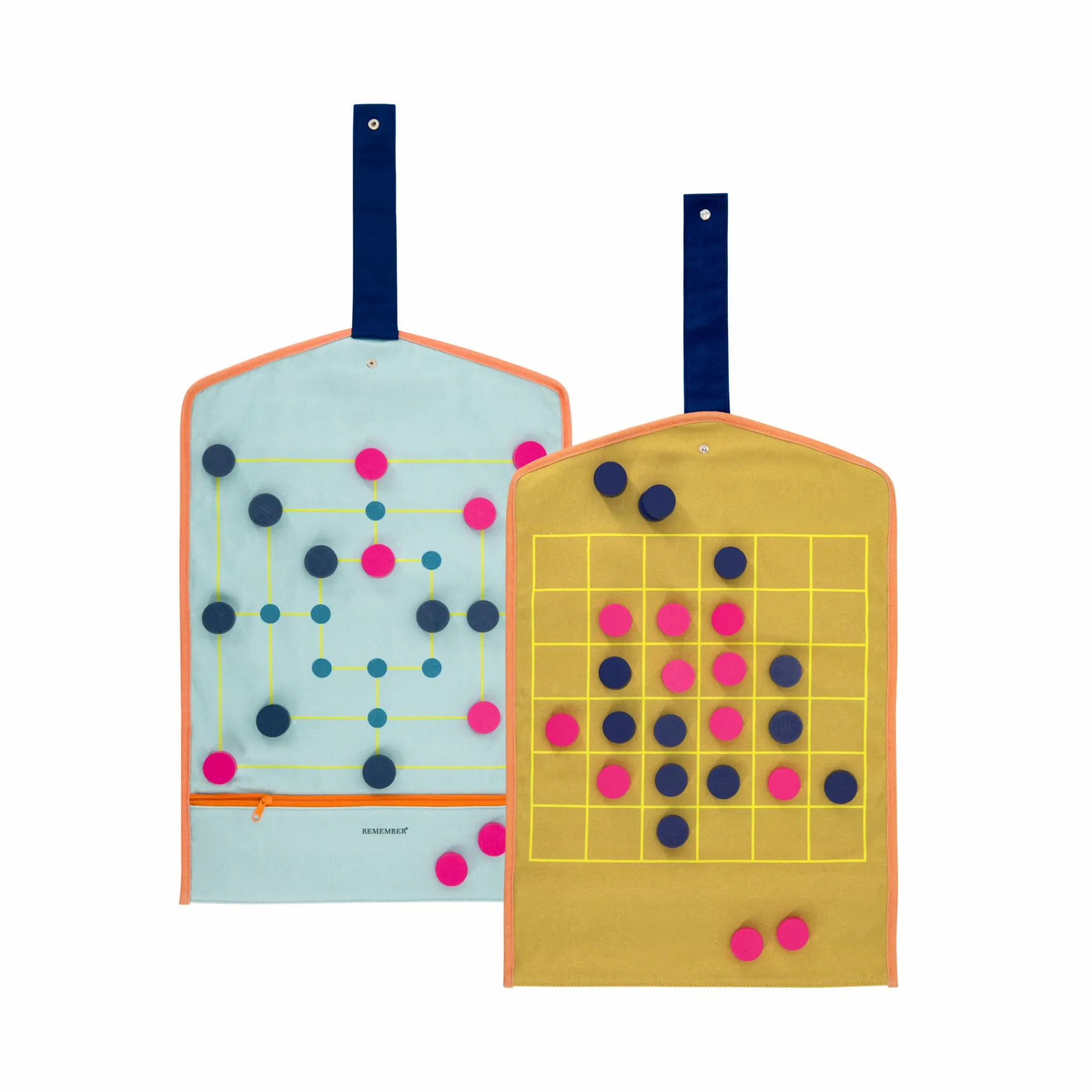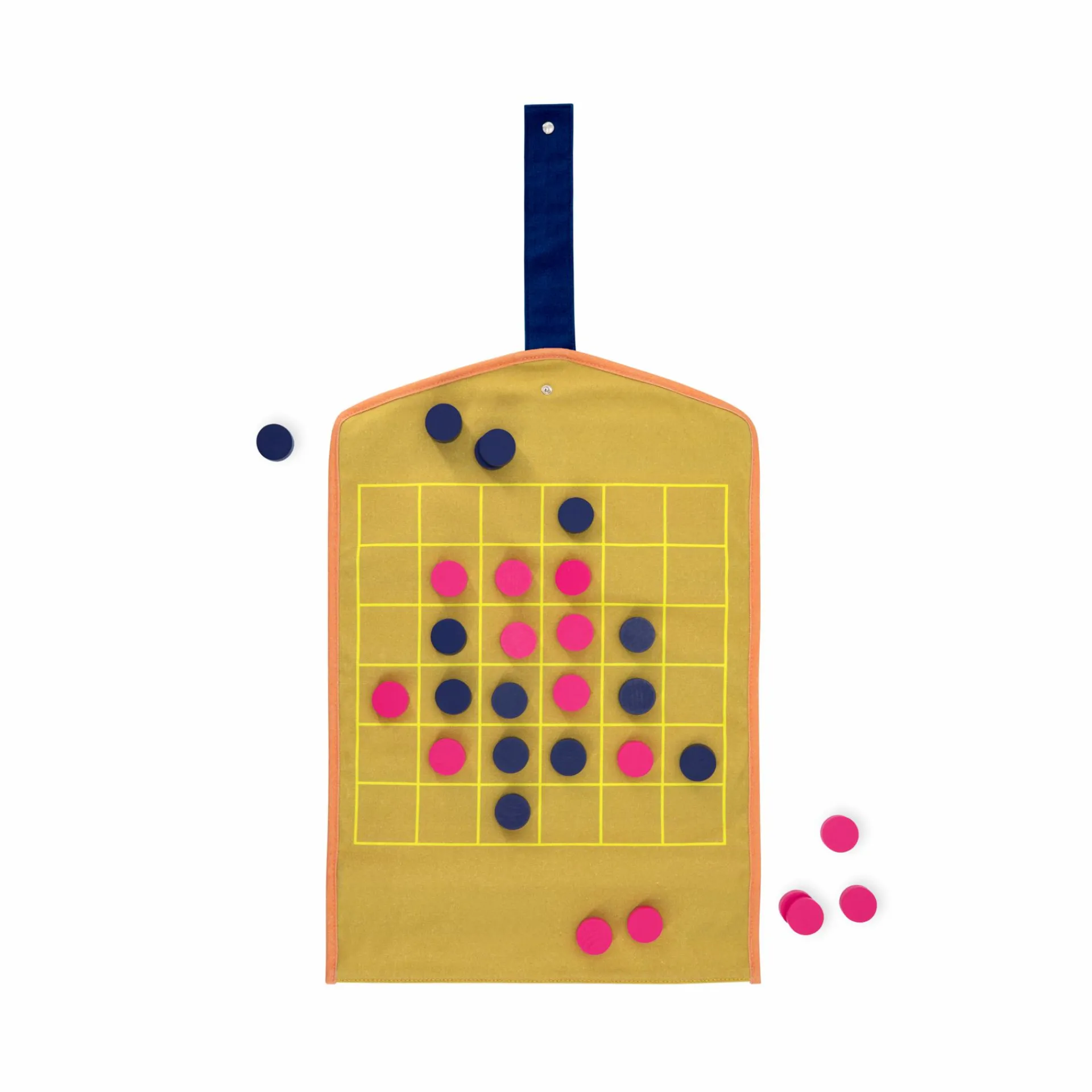Lust auf ein Spielchen unterwegs? Das textile Mühle-/4 in einer Reihe-Spiel aus Baumwolle ist ideal für lange Autofahrten, den Park oder Strand. Zum Transport wird das Spiel einfach zusammengerollt und mit einem Druckknopf verschlossen. Die farbenfrohen Spielsteine sind in einer integrierten Tasche untergebracht.