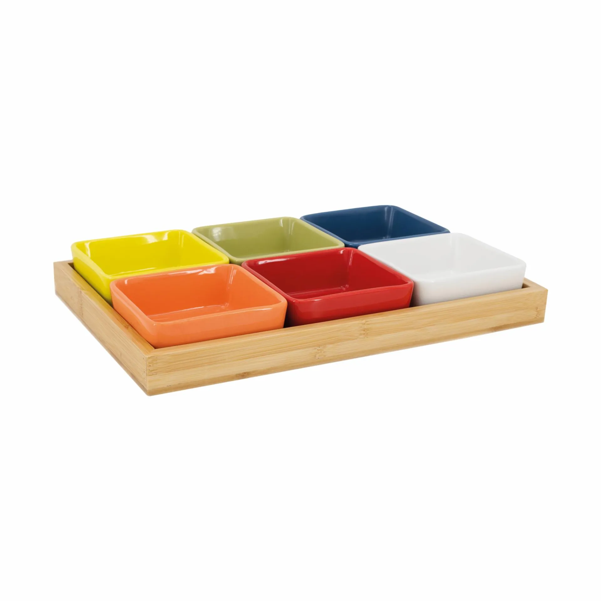 Für schälchenweise Abwechslung in bunten Farben sorgt dieses Schalenset mit Holztablett. Für Cracker und Nüsse zum Aperitif, Tapas am Abend, Saucen beim Barbecue oder Knabberzeug für zwischendurch.