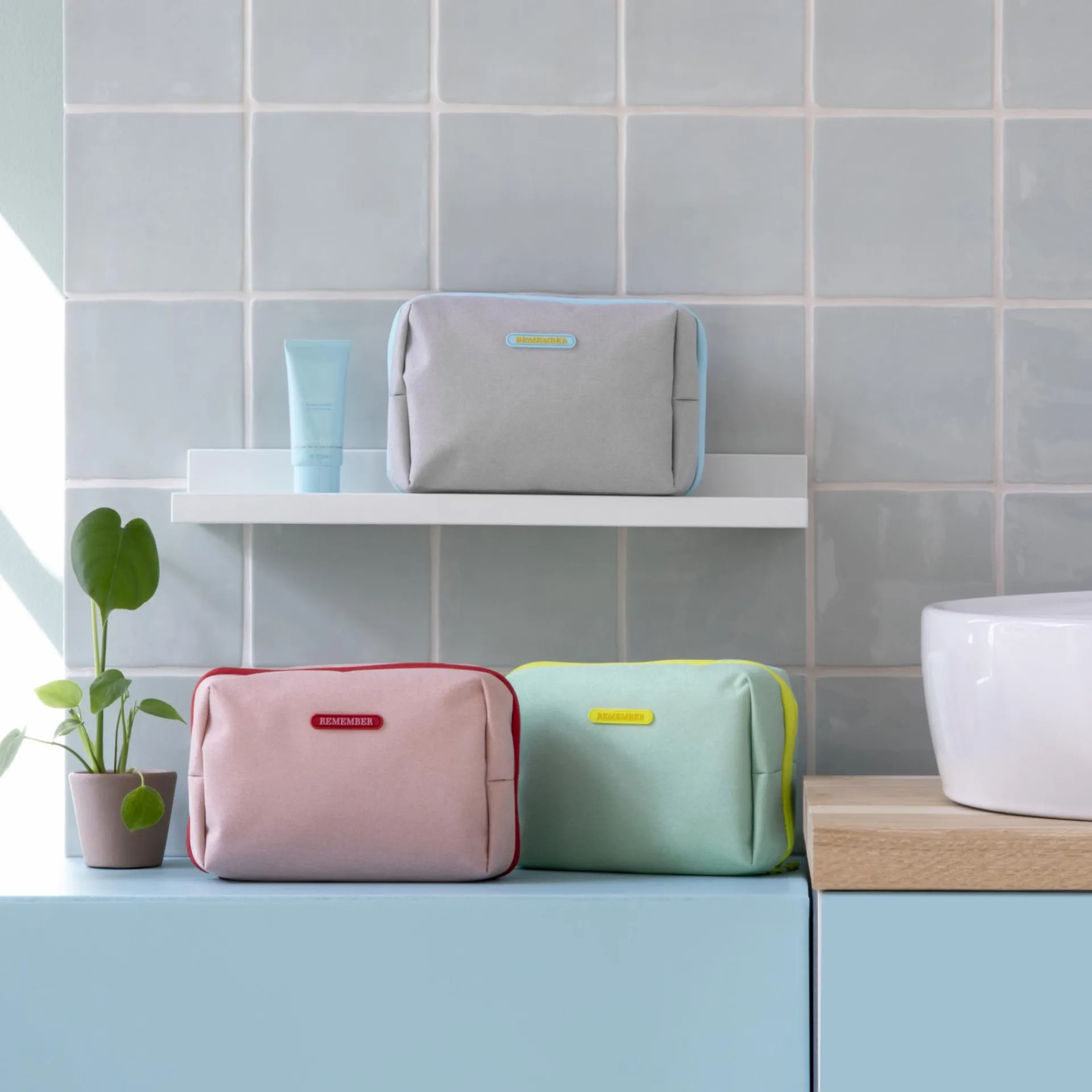 Die Kulturtaschen sind Teil der REMEMBER®-Badserie und passen zu den Badteppichen, den Handtüchern und dem Waschlappen-Set.