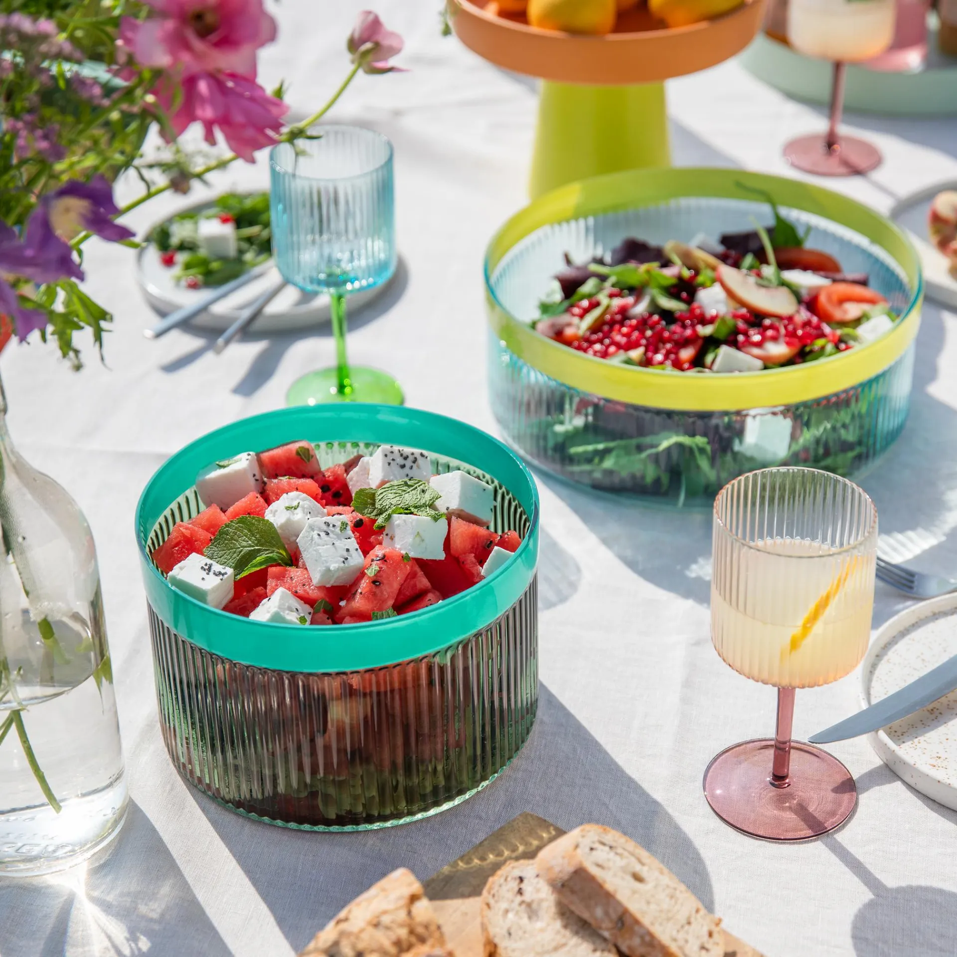 Ob auf dem Sideboard, dem Esstisch oder im Wohnzimmer – die Glasschale Groove ist ein echtes Highlight. Das gefärbte, geriffelte Glas spielt mit dem Licht und sorgt so für faszinierende Effekte. Mit ihrer besonderen Struktur und der farbigen Umrandung bringt die Schale Pflanzenarrangements, Obst oder den Salat zum Abendessen perfekt zur Geltung und verleiht dem Zuhause eine entspannte Eleganz und stilvolle Note.