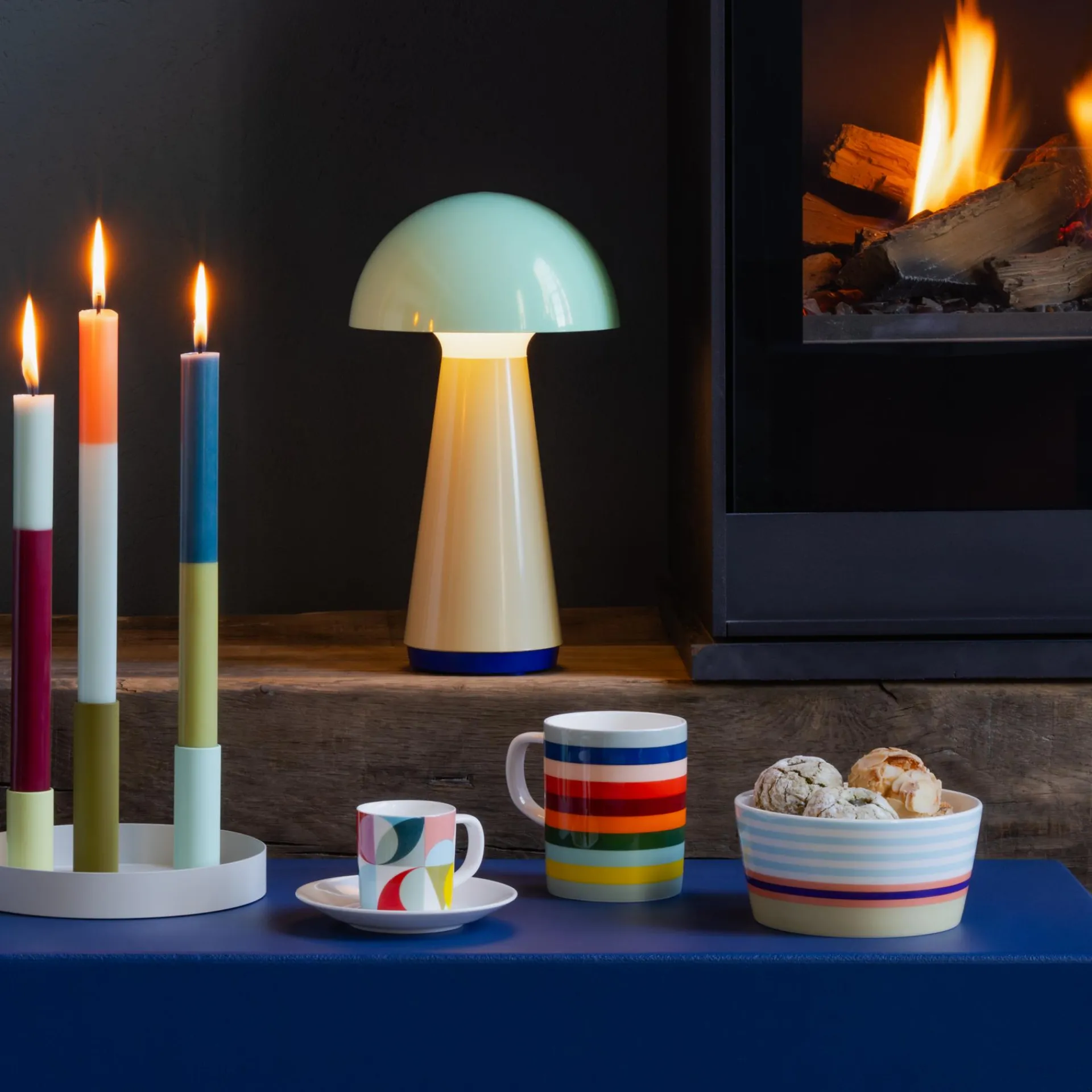 Sorgt schon morgens für gute Laune: farbenfrohe Tasse, die durch den ganzen Tag begleitet. Dazu passen die Müslischalen und Espressotassen aus derselben Kollektion.