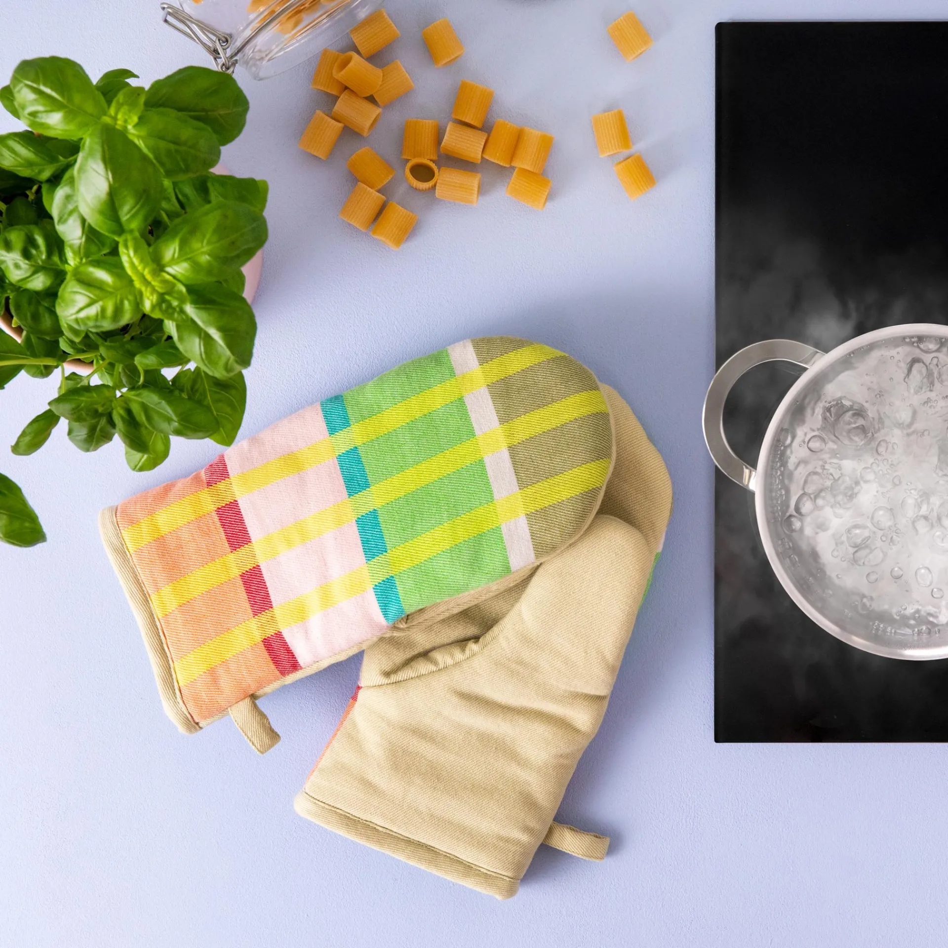 Backen, kochen, brutzeln, grillen – sicheren Hitzeschutz beim Hantieren mit heißem Kochgerät bieten die Ofenhandschuhe. Das Küchenbasic besteht aus einem 2er-Set mit unterschiedlichen, farblich aufeinander abgestimmten Streifendesigns und ist eine schöne Ergänzung zur farbenfrohen Geschirrtuch-Serie.