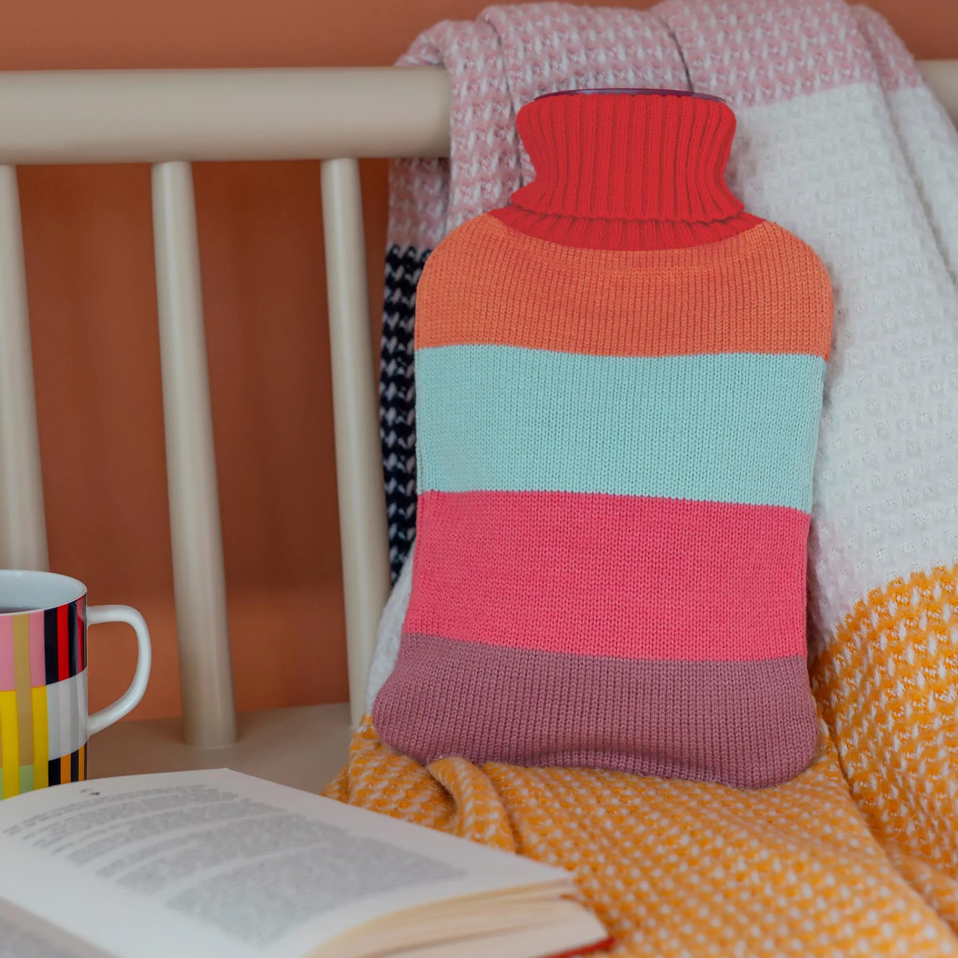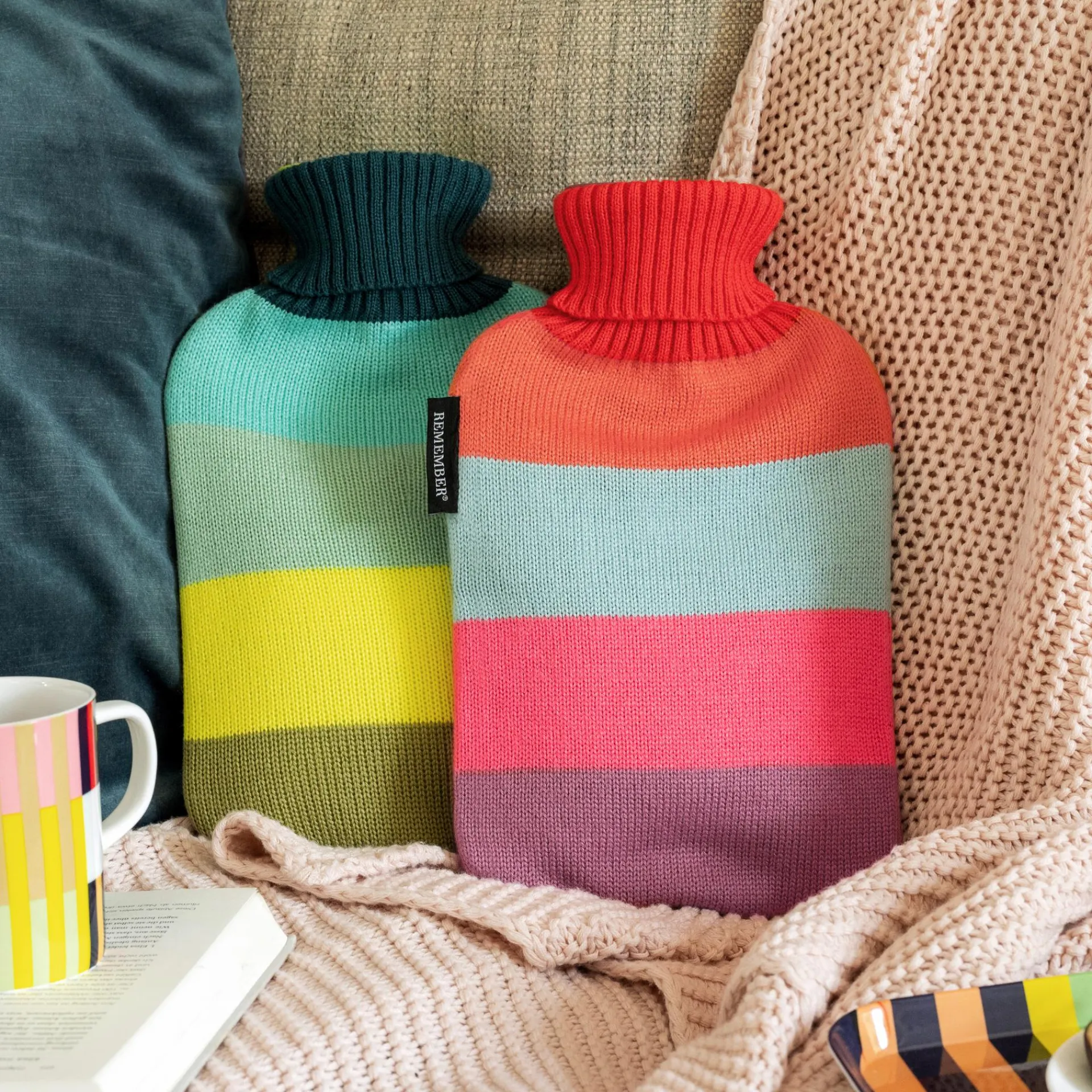 Wenn es draußen knackig kalt ist, ist eine Wärmflasche auf dem Sofa oder dem Bett so richtig gemütlich. Unsere Wärmflaschen haben einen weichen, abnehmbaren Strickbezug in farbenfrohen Streifen und sorgen so auch optisch für jede Menge Wohlbefinden.
