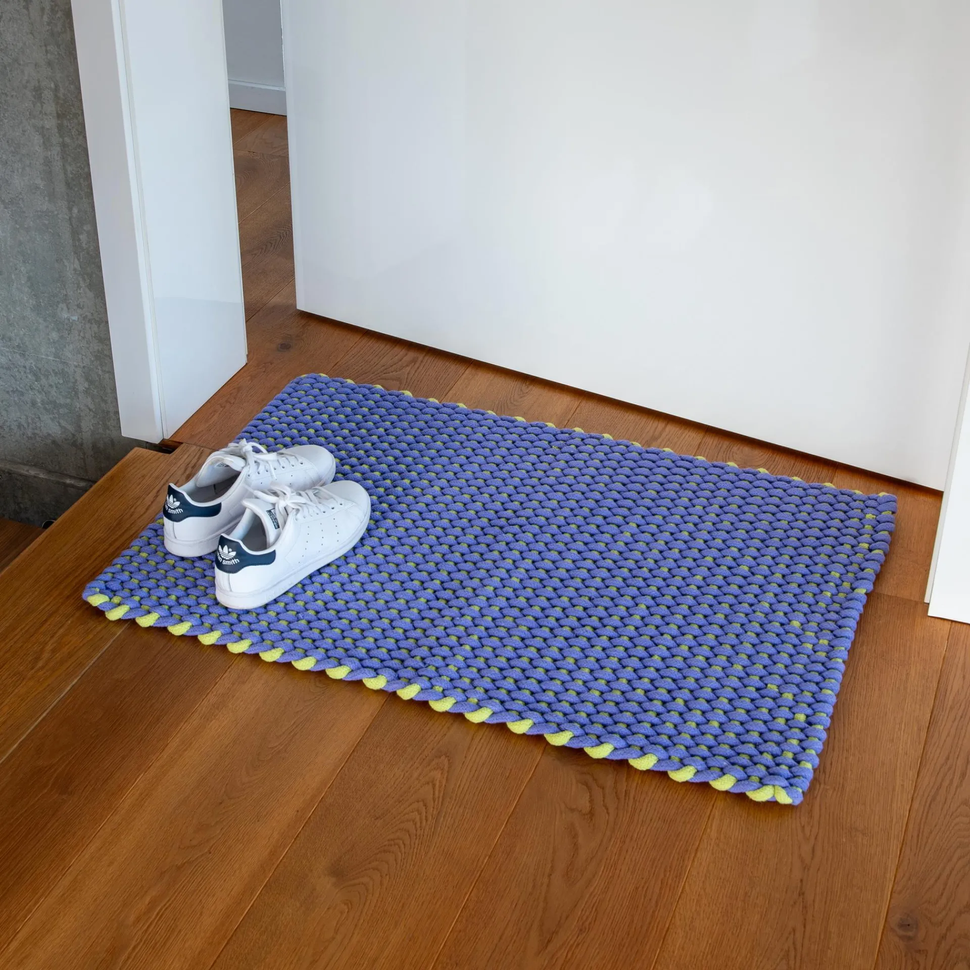 Diese Fußmatte besticht durch ihr schlichtes, aber stilvolles Design in zwei harmonisch aufeinander abgestimmten Farben. Die hochwertige Matte ist handgewebt und ihre besondere Textur und Robustheit macht sie zu einem langlebigen Begleiter im Alltag.
