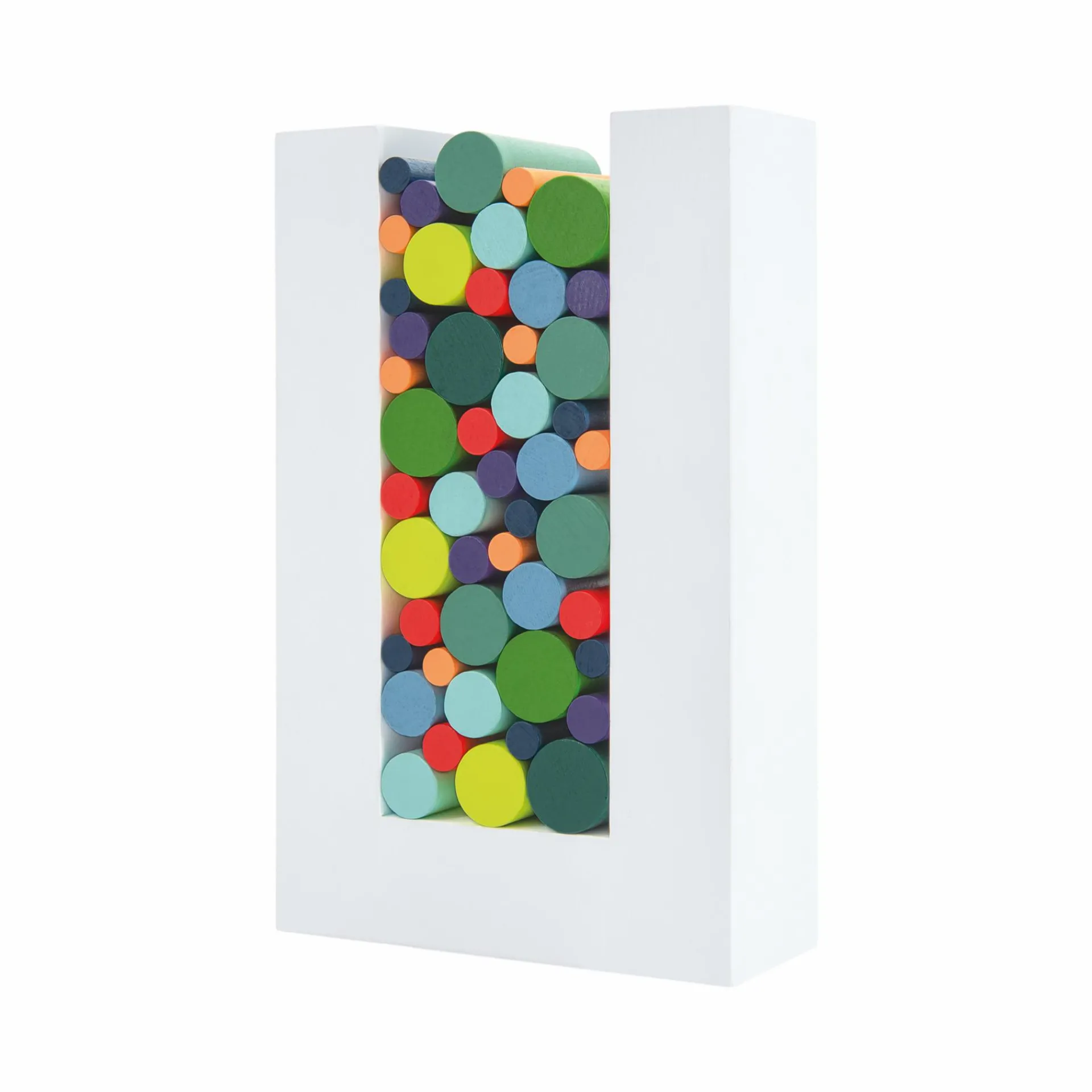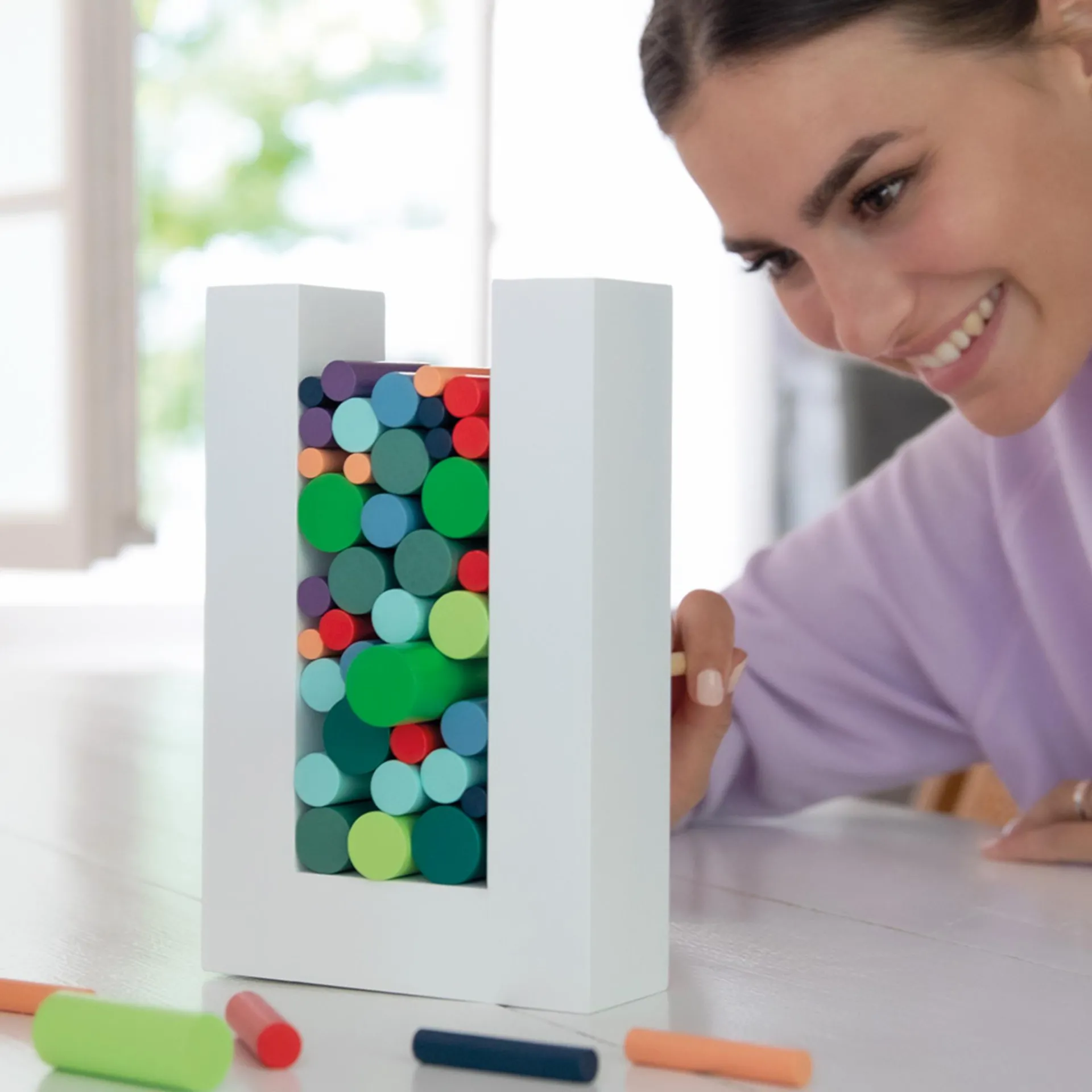 Bei diesem hübschen Spiel sind Konzentration und Geschick gefragt: Mit Hilfe der Holzstäbe müssen nach und nach die gestapelten, farbigen Holz-Zylinder aus dem Spielrahmen geschoben werden. Aber Achtung: Es darf nichts wackeln oder rutschen, sonst ist der nächste Spieler an der Reihe.