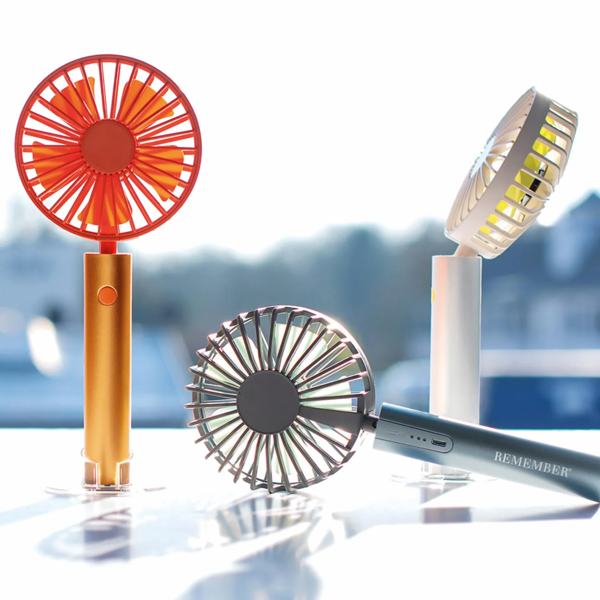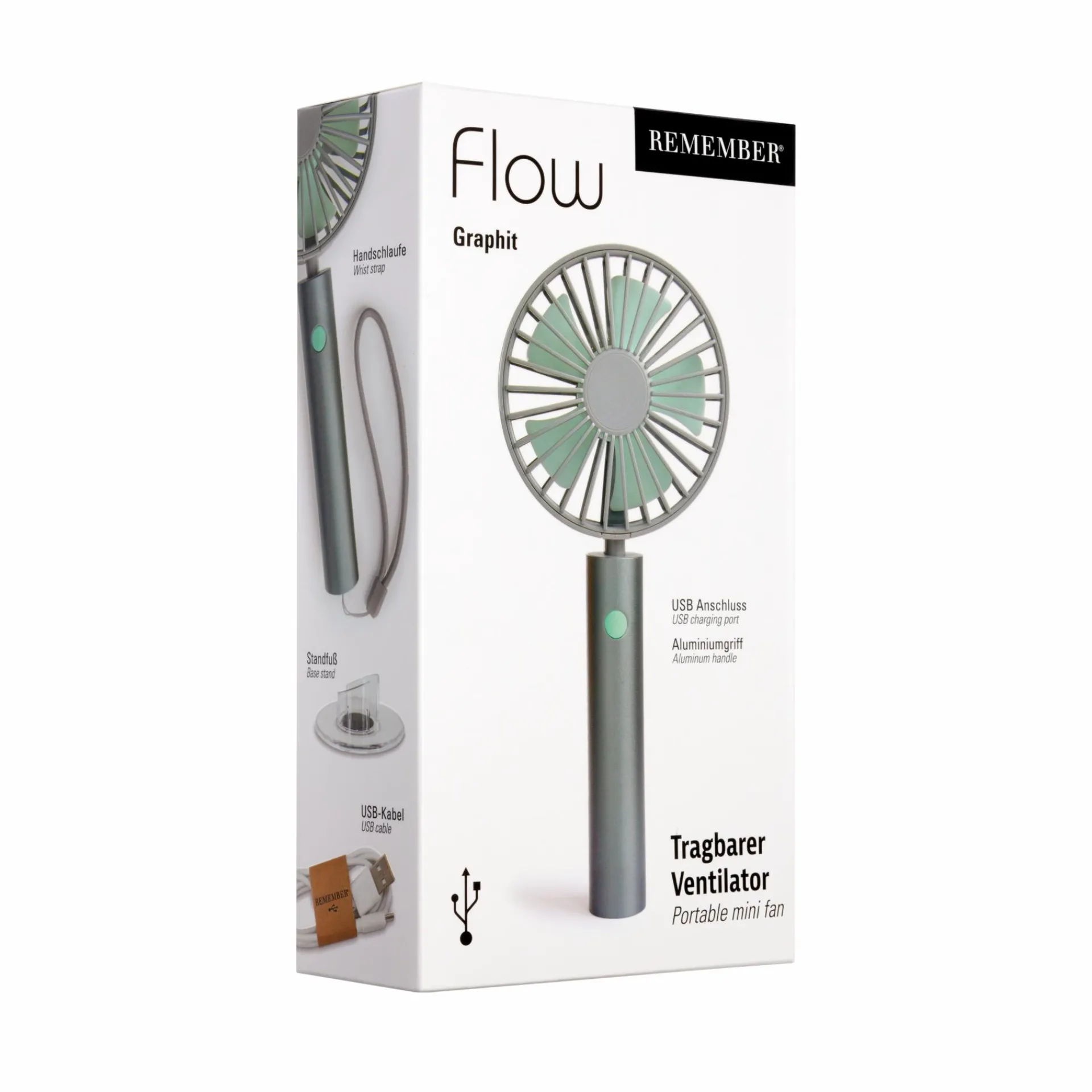 Handlich, mobil, stylisch – der aufladbare Akku-Ventilator Flow für drinnen & draußen sorgt für viel frischen Wind. Mit Standfuß und Handschlaufe sorgt Flow immer für eine kühle Brise – egal, ob man am Schreibtisch s(chw)itzt oder in der U-Bahn steht. Aufladen kann man Flow ganz bequem mit dem beiliegenden USB-Kabel.