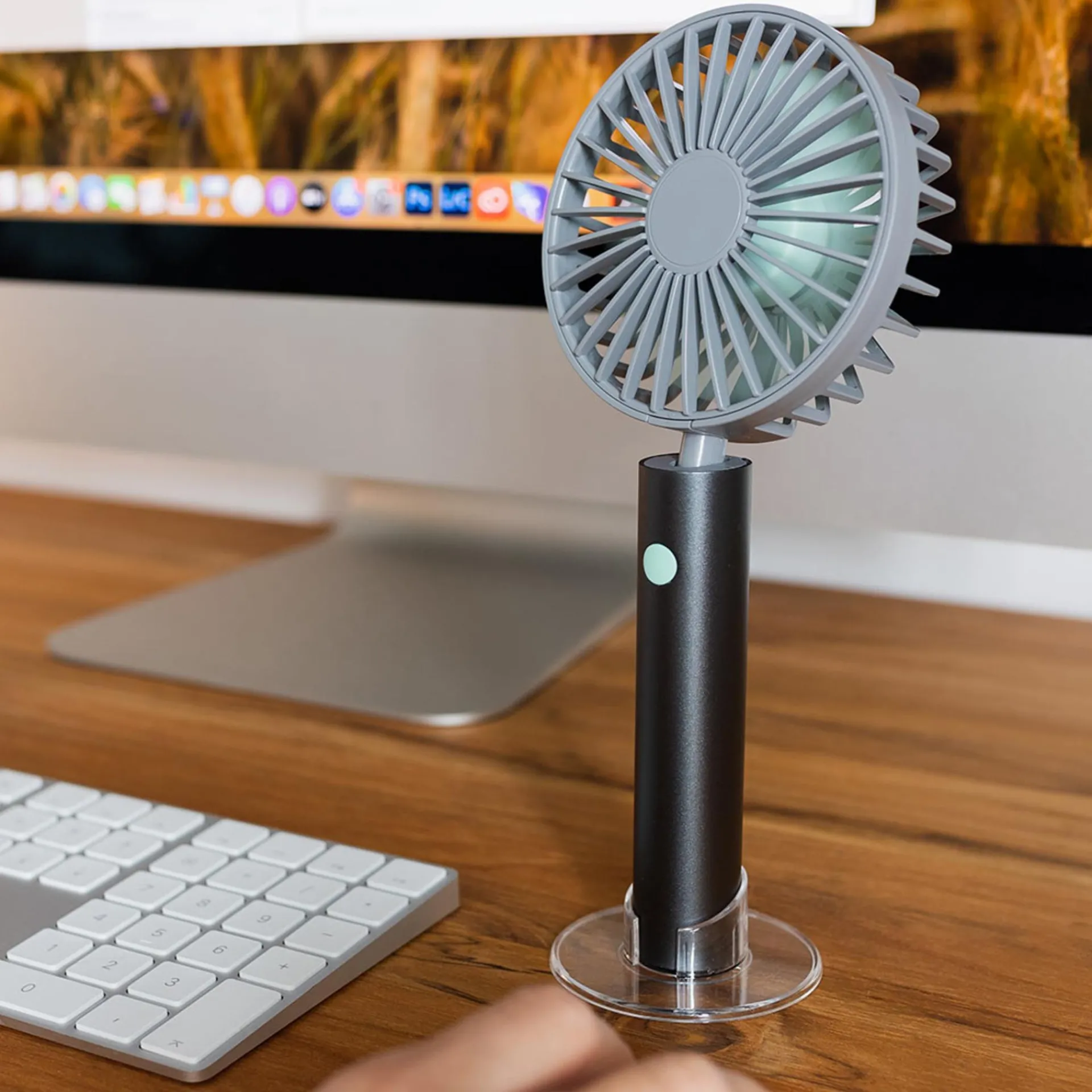 Wiederaufladbar via USB-Kabel, inkl. transparentem Standfuß, Handschlaufe, 3 Geschwindigkeitsstufen, schwenkbarer Kopf, Akku-/Ladestandanzeige, Laufzeit bis zu 7 Stunden, Ladezeit ca. 2 Stunden, Akkubetrieb: 2000 mA / 5V, Gewicht 200g, Netzteil nicht enthalten