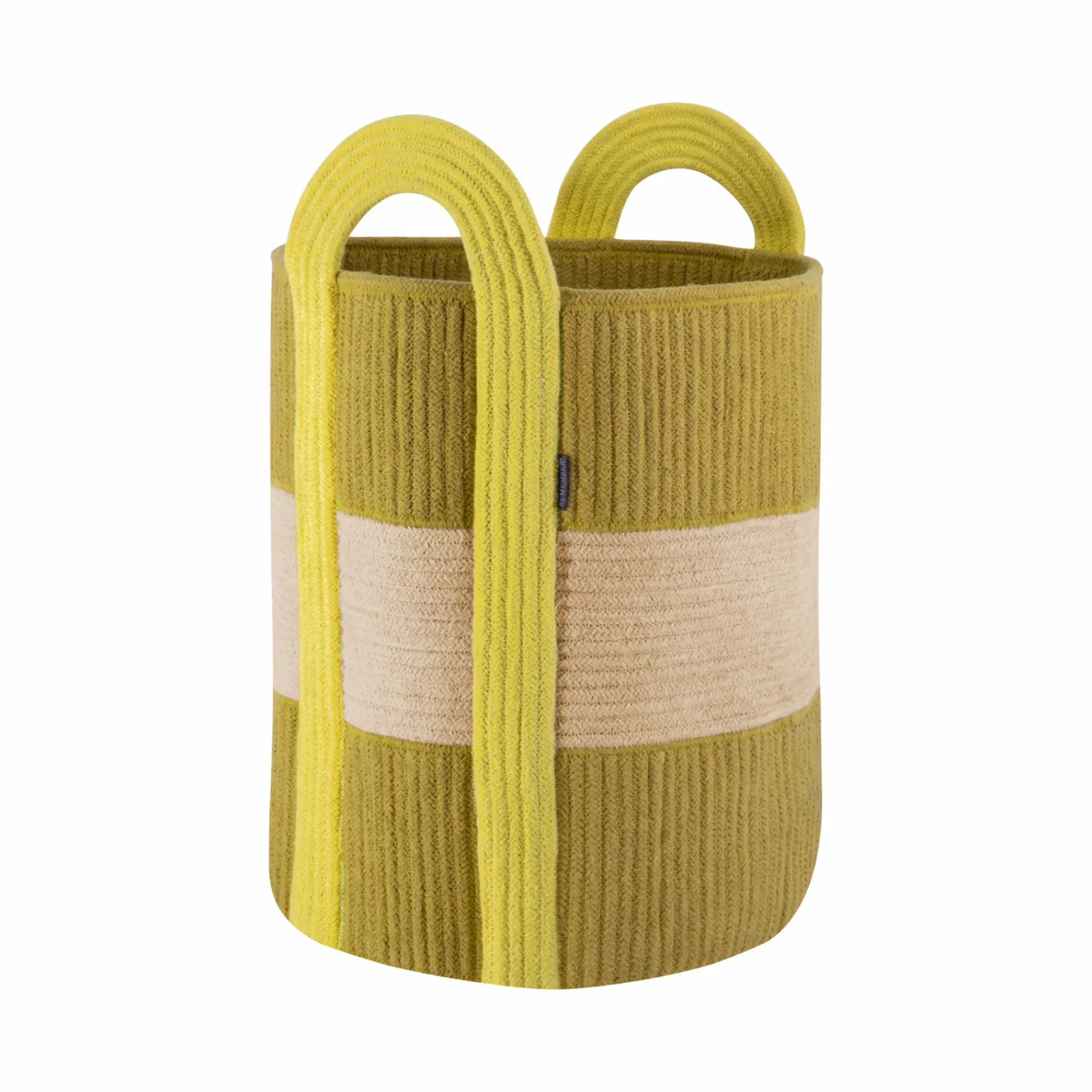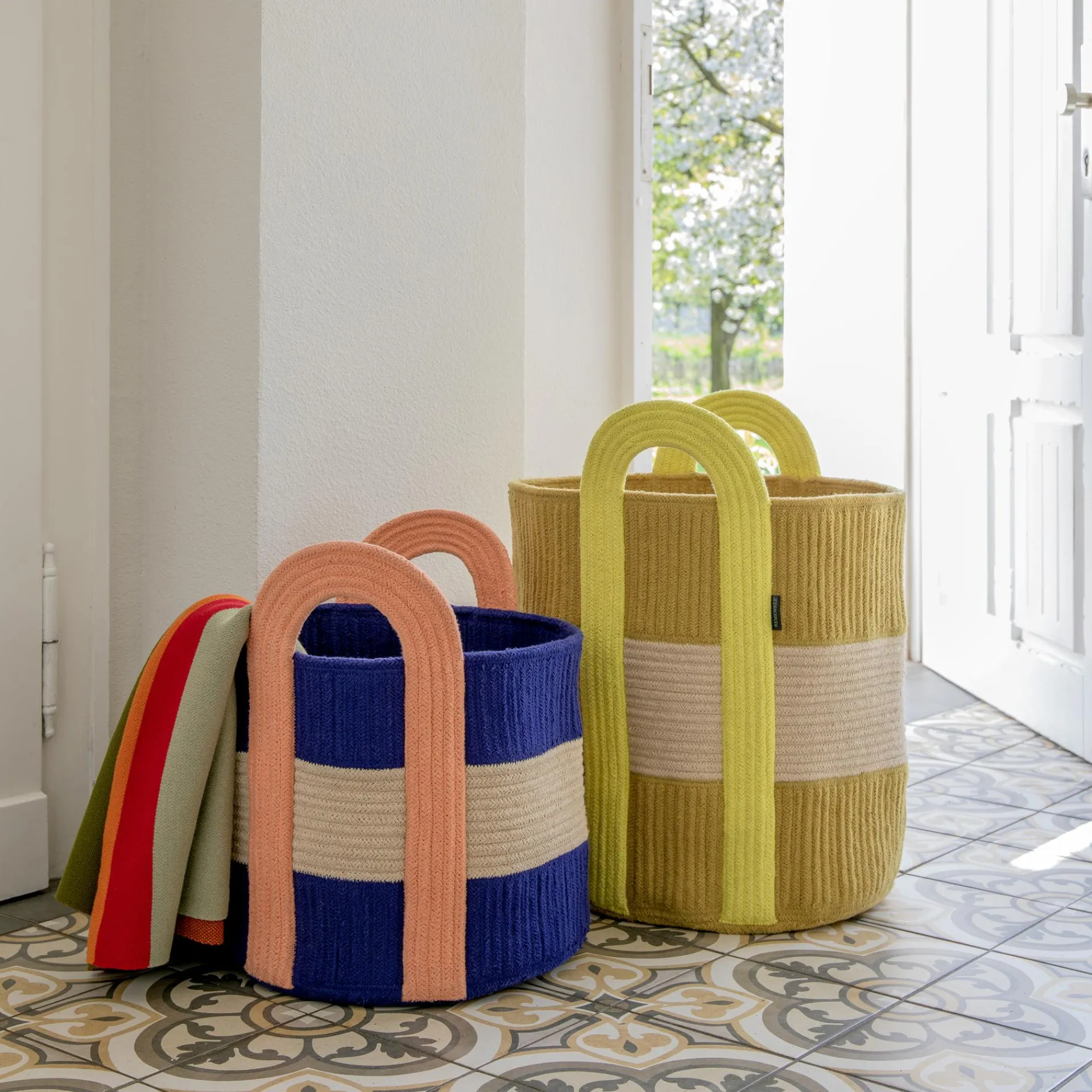 Aufbewahrungsaccessoire und Dekorations-Objekt: Der wunderschöne, mehrfarbige Korb in klassischer Zylinderform bewahrt sehr dekorativ Zeitschriften, Kissen und Decken im Wohnzimmer oder Handtücher und Wäsche im Badezimmer. Ein toller Eyecatcher, von dem man seine Augen einfach nicht lassen kann.