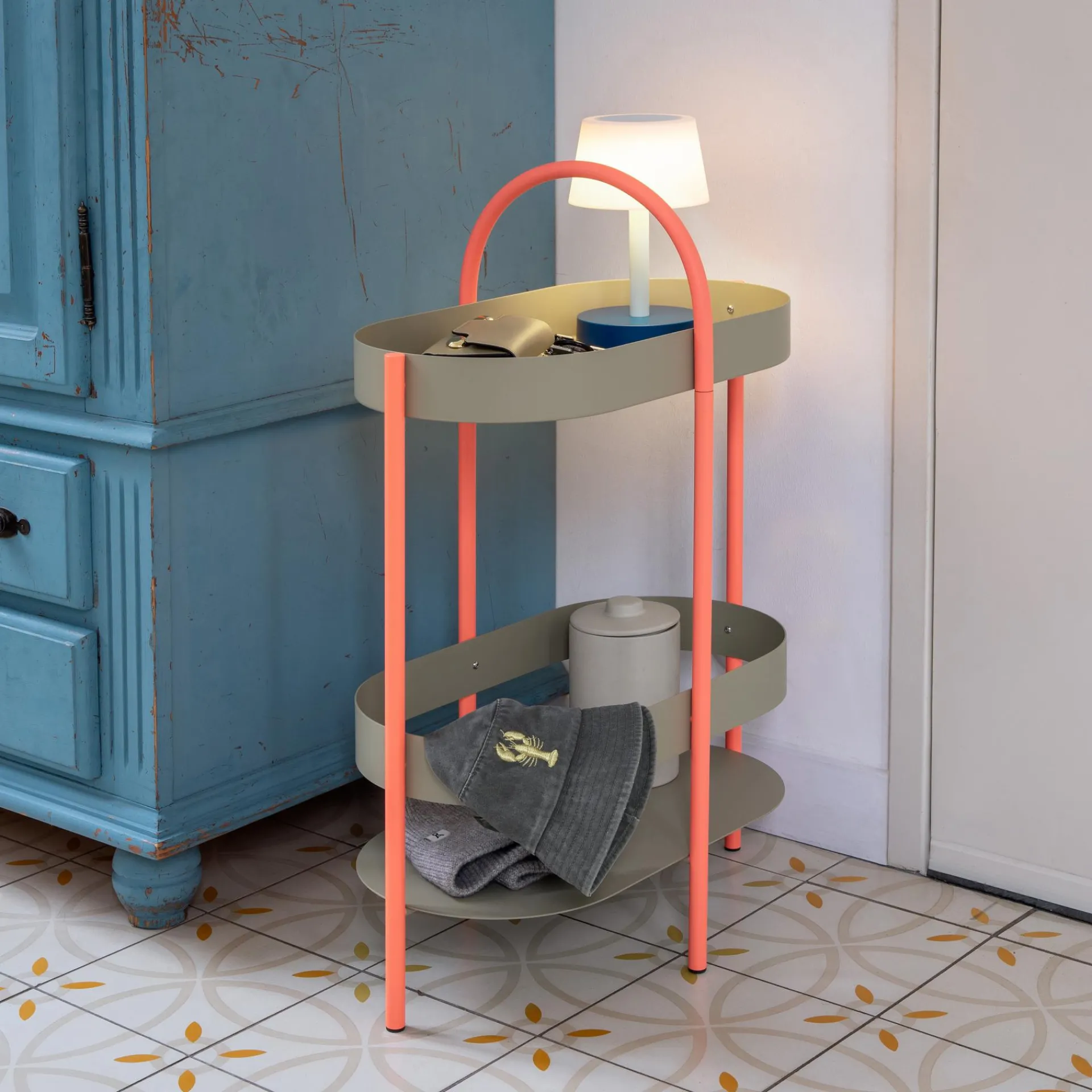 Regal, Beistelltisch, Barmöbel – die Beistellkonsole Barbara kann mit ihren beiden Ebenen und dem praktischen Henkel multifunktional genutzt werden. Getränke und Snacks von der Küche auf die Terrasse, Bücher und Leuchte vom Wohnzimmer ins Schlafzimmer – dank ihrer Konstruktion ist Barbara leicht zu transportieren, ohne dass etwas herunterfällt.
