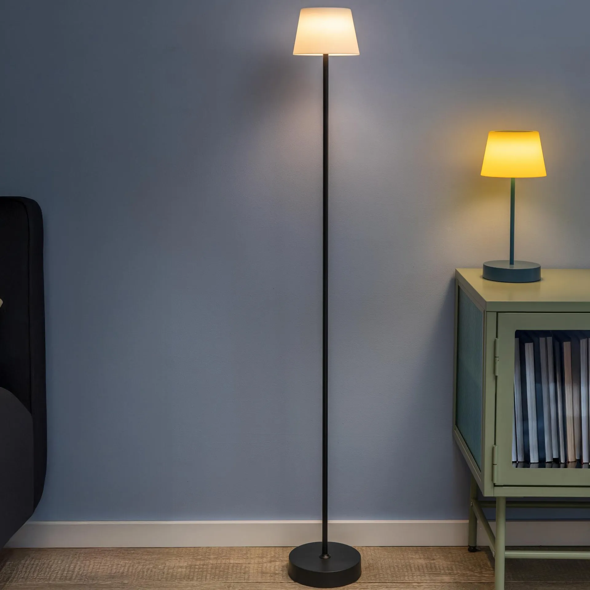Drinnen oder draußen, in ganzer Höhe oder verkürzt ohne Mittelteil, gedimmt oder mit voller Leuchtkraft – die Stehleuchte William ist so flexibel, dass sie zu jeder Lebenslage passt. Einmal aufgeladen, leuchtet die energieeffiziente Leuchte bis zu 80 Stunden auf niedrigster Stufe – ganz ohne Kabel. Per Touch-Sensor auf dem Lampenschirm lässt sich die Leuchte ein- und ausschalten sowie dreistufig dimmen. Ob als atmosphärisches Licht im Wohnzimmer oder auf der Terrasse, der schlanke William macht überall eine gute Figur.