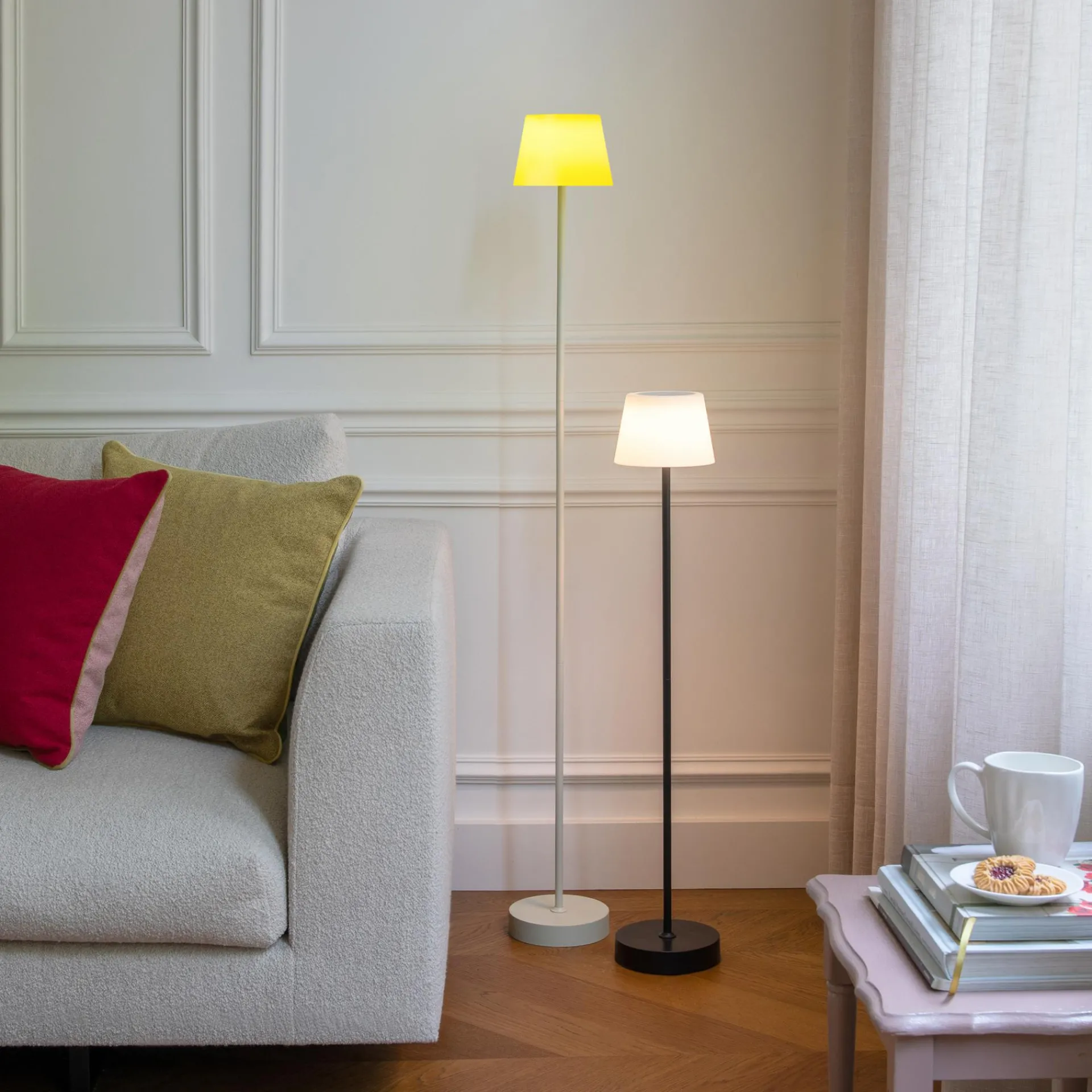 Drinnen oder draußen, in ganzer Höhe oder verkürzt ohne Mittelteil, gedimmt oder mit voller Leuchtkraft – die Stehleuchte William ist so flexibel, dass sie zu jeder Lebenslage passt. Einmal aufgeladen, leuchtet die energieeffiziente Leuchte bis zu 80 Stunden auf niedrigster Stufe – ganz ohne Kabel. Per Touch-Sensor auf dem Lampenschirm lässt sich die Leuchte ein- und ausschalten sowie dreistufig dimmen. Ob als atmosphärisches Licht im Wohnzimmer oder auf der Terrasse, der schlanke William macht überall eine gute Figur.