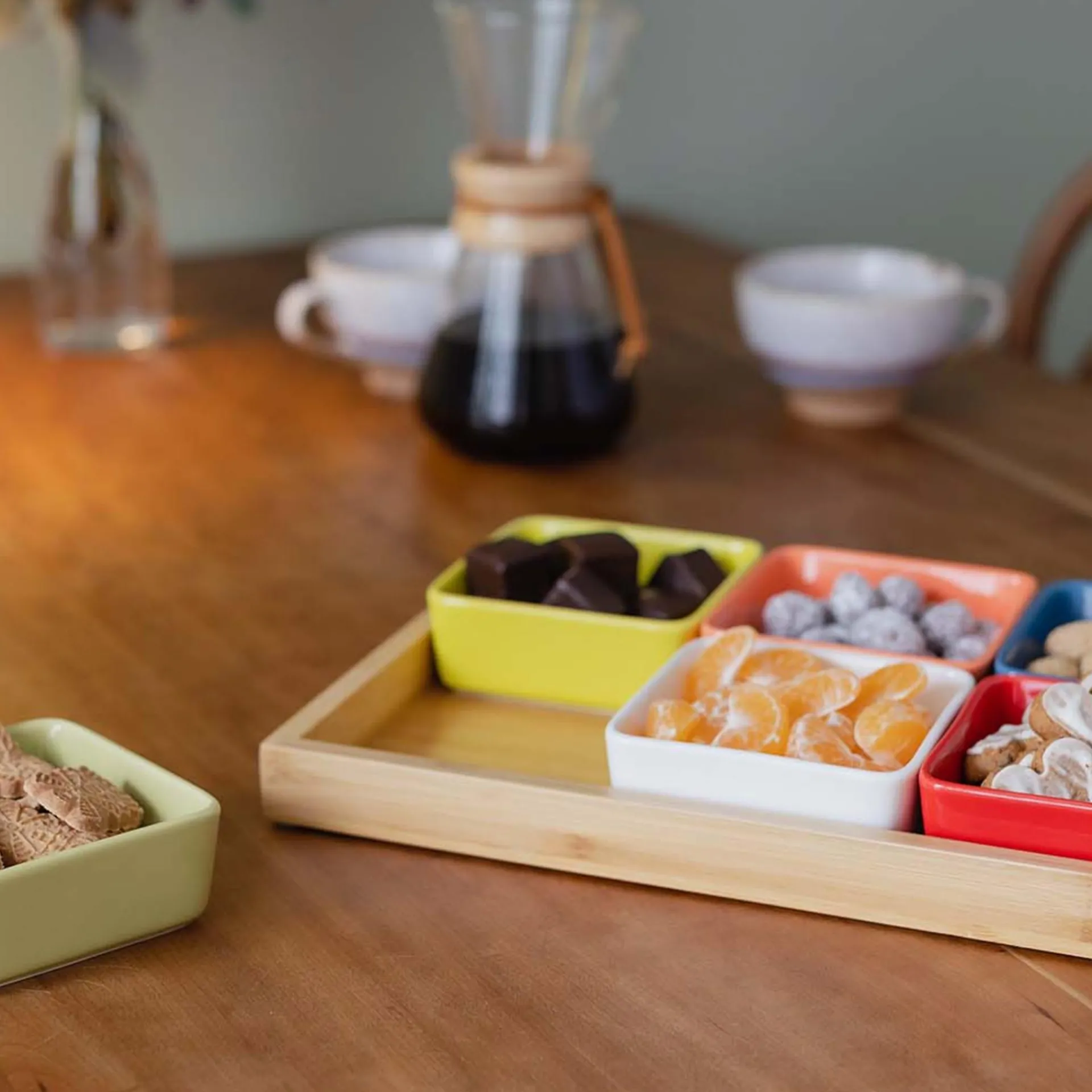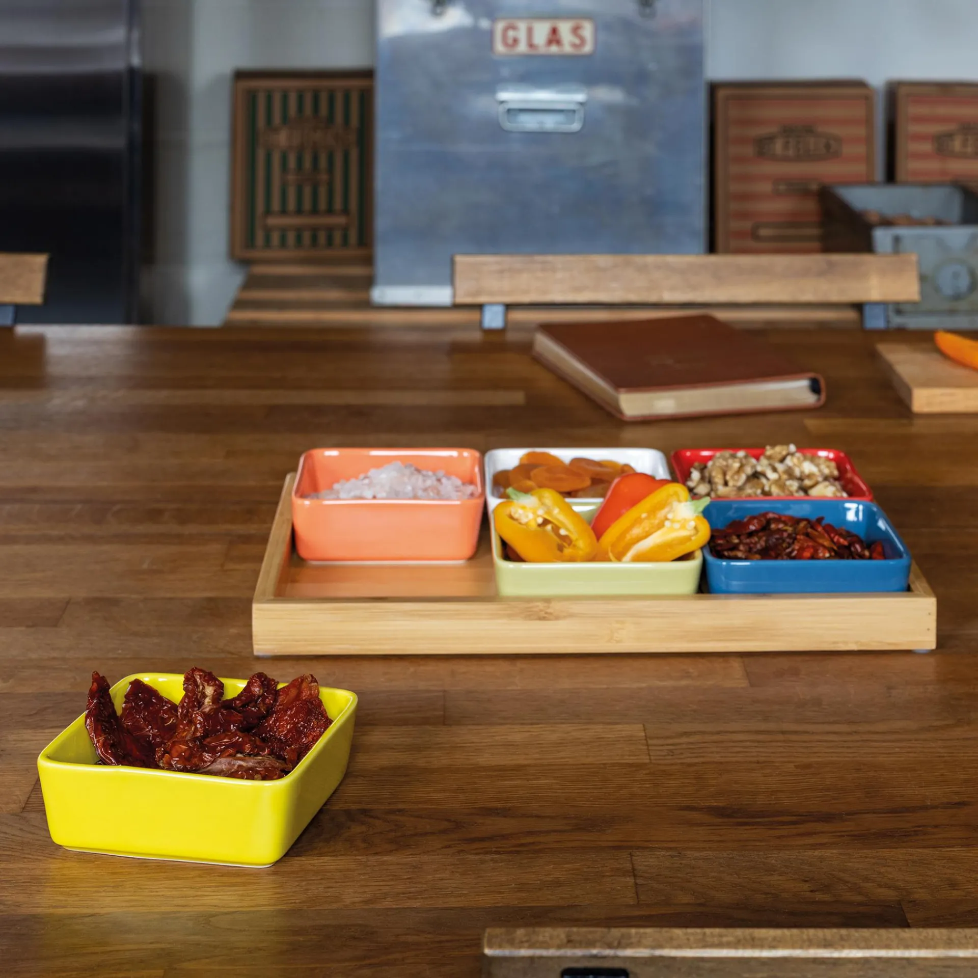 Für schälchenweise Abwechslung in bunten Farben sorgt dieses Schalenset mit Holztablett. Für Cracker und Nüsse zum Aperitif, Tapas am Abend, Saucen beim Barbecue oder Knabberzeug für zwischendurch.