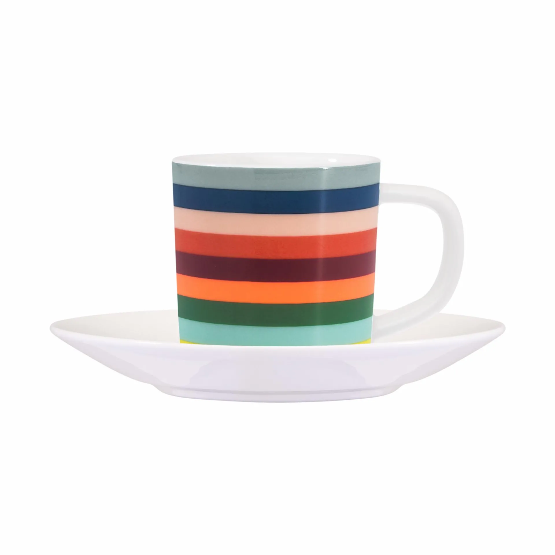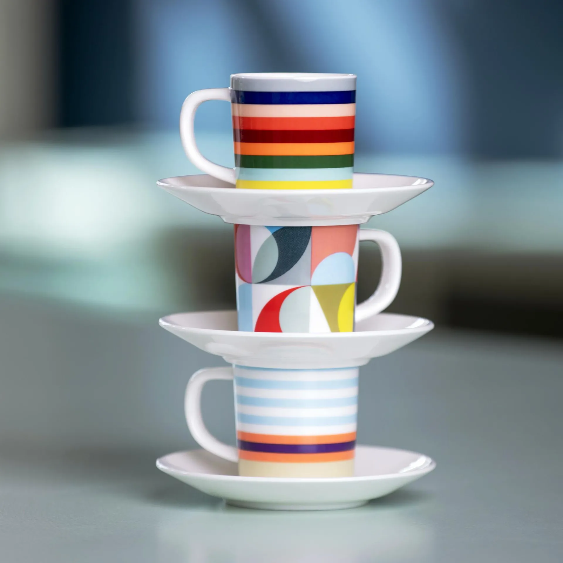 Für den kleinen Kick nach dem Essen oder zwischendurch: farbenfrohe Espressotassen. Schönes Detail: Der Unterteller nimmt das Muster farblich auf.