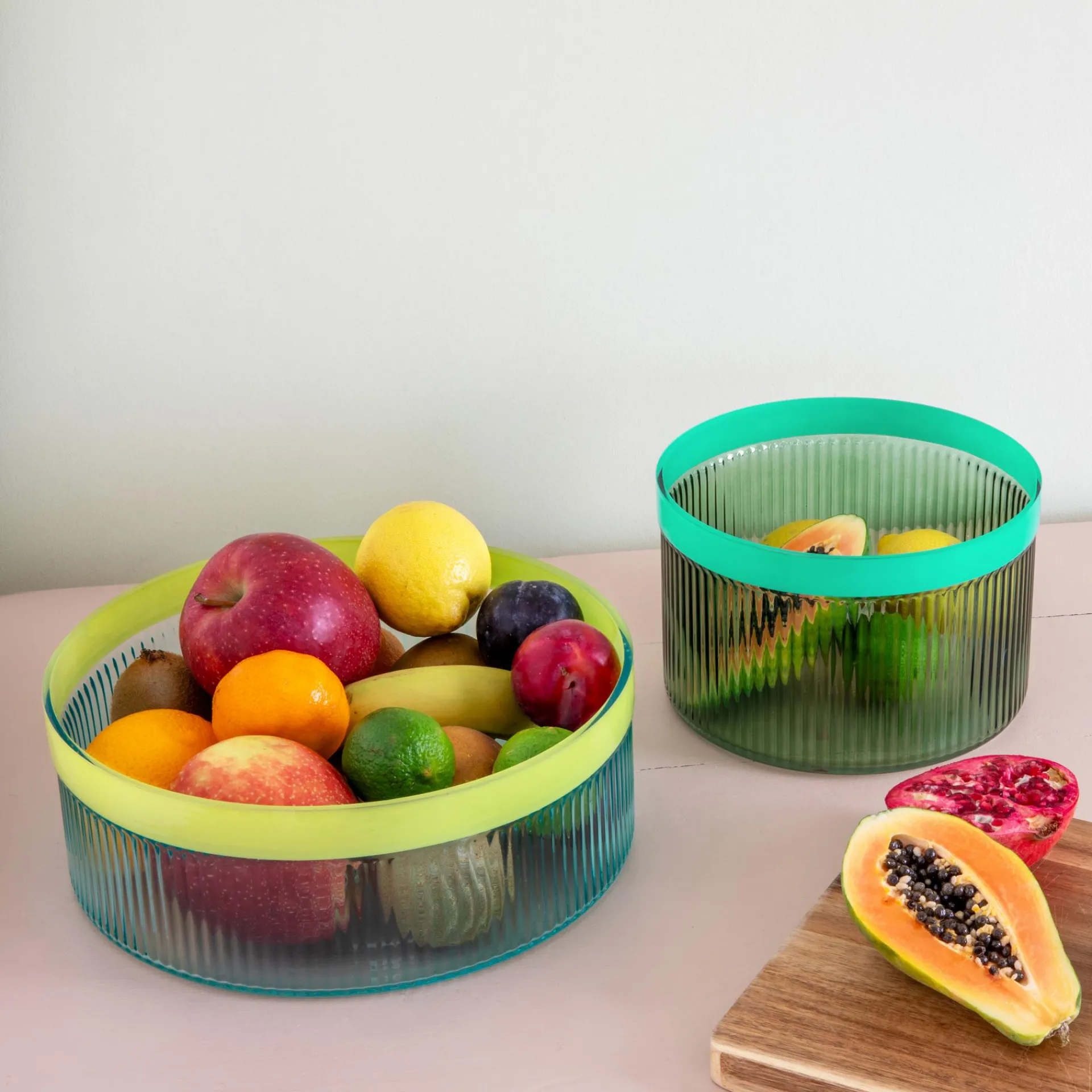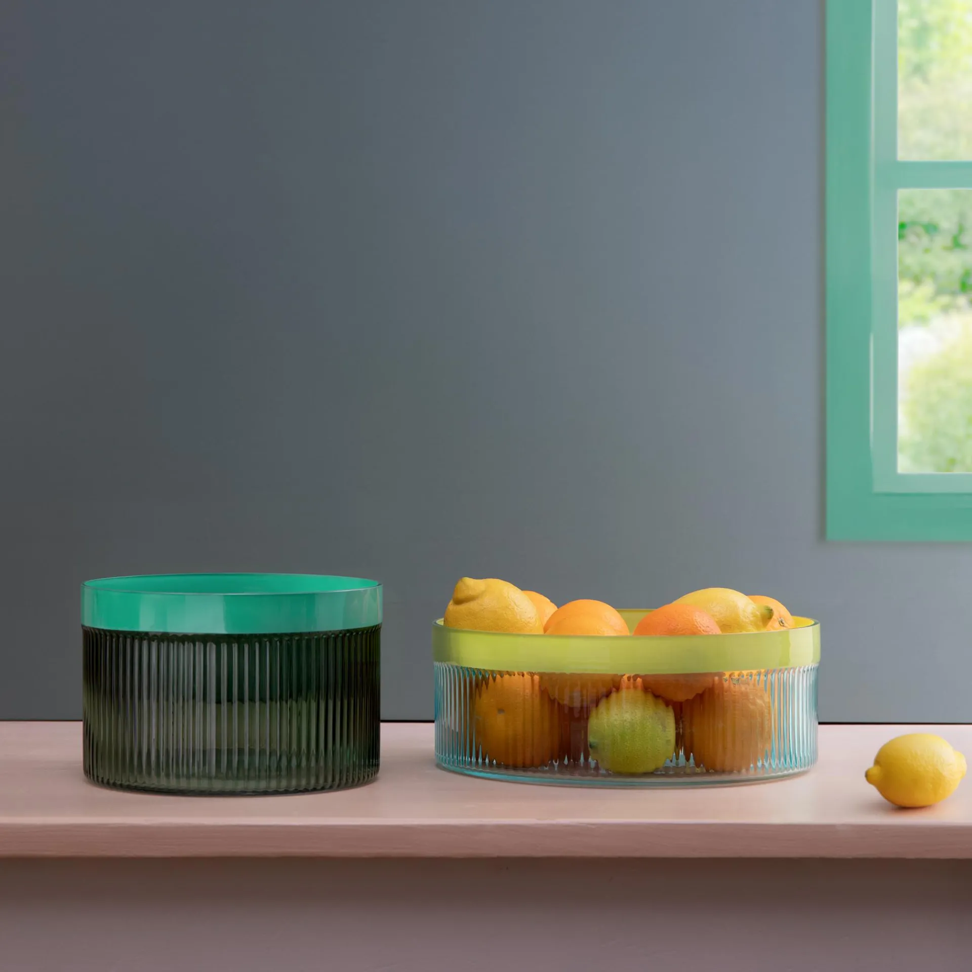 Ob auf dem Sideboard, dem Esstisch oder im Wohnzimmer – die Glasschale Groove ist ein echtes Highlight. Das gefärbte, geriffelte Glas spielt mit dem Licht und sorgt so für faszinierende Effekte. Mit ihrer besonderen Struktur und der farbigen Umrandung bringt die Schale Pflanzenarrangements, Obst oder den Salat zum Abendessen perfekt zur Geltung und verleiht dem Zuhause eine entspannte Eleganz und stilvolle Note.