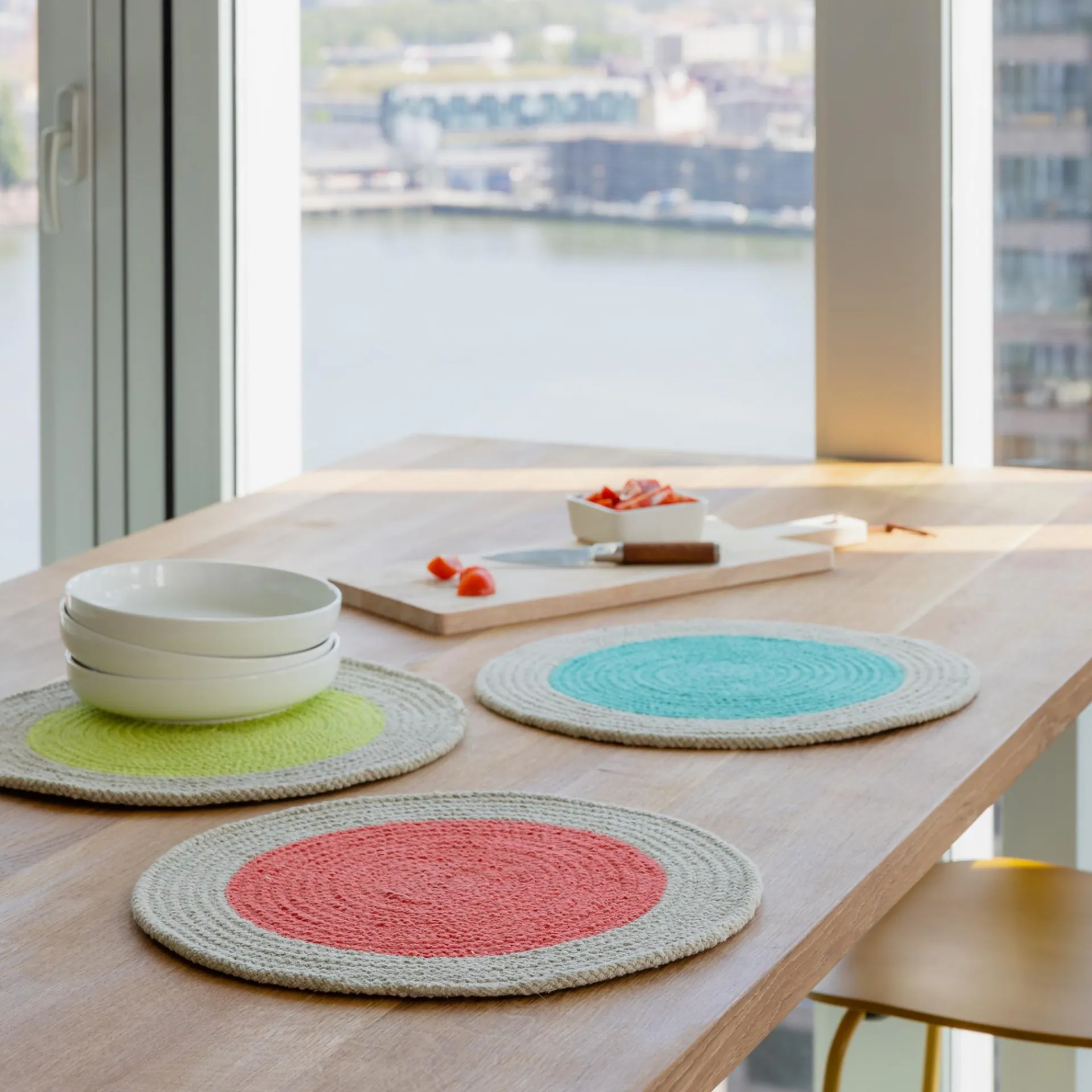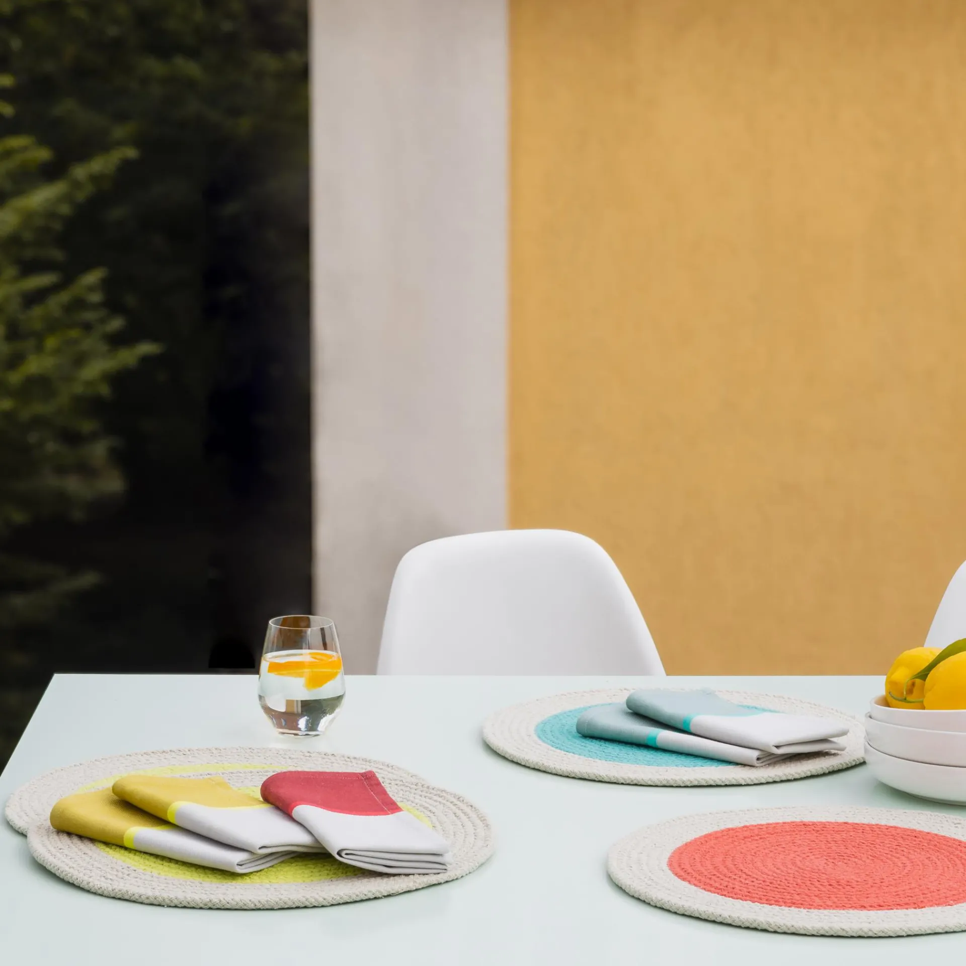 Runde Tischsets, die Farbe auf den Tisch bringen. Mit den Sets aus Baumwollseil wird der gedeckte Tisch noch einladender und die Tischoberfläche ist vor Flecken geschützt. Passende Ergänzung: die auf die Sets farblich abgestimmten Baumwoll-Servietten, die ebenfalls im 2er-Set erhältlich sind.