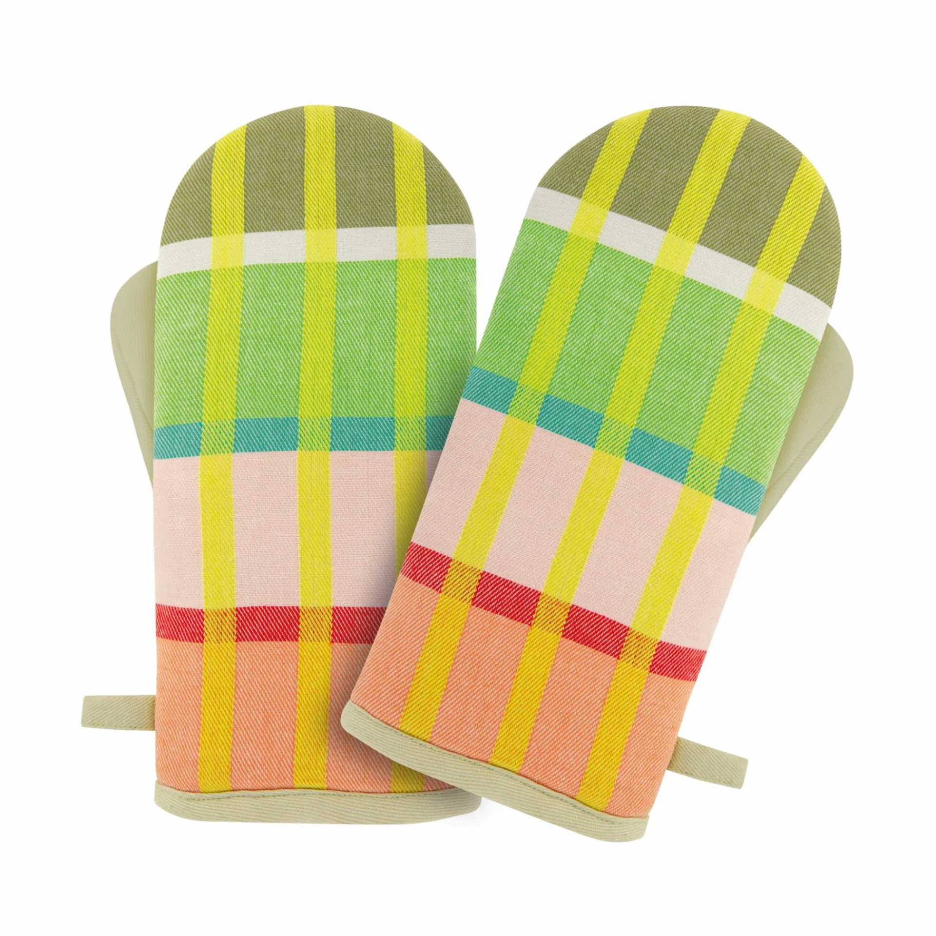 Backen, kochen, brutzeln, grillen – sicheren Hitzeschutz beim Hantieren mit heißem Kochgerät bieten die Ofenhandschuhe. Das Küchenbasic besteht aus einem 2er-Set mit unterschiedlichen, farblich aufeinander abgestimmten Streifendesigns und ist eine schöne Ergänzung zur farbenfrohen Geschirrtuch-Serie.